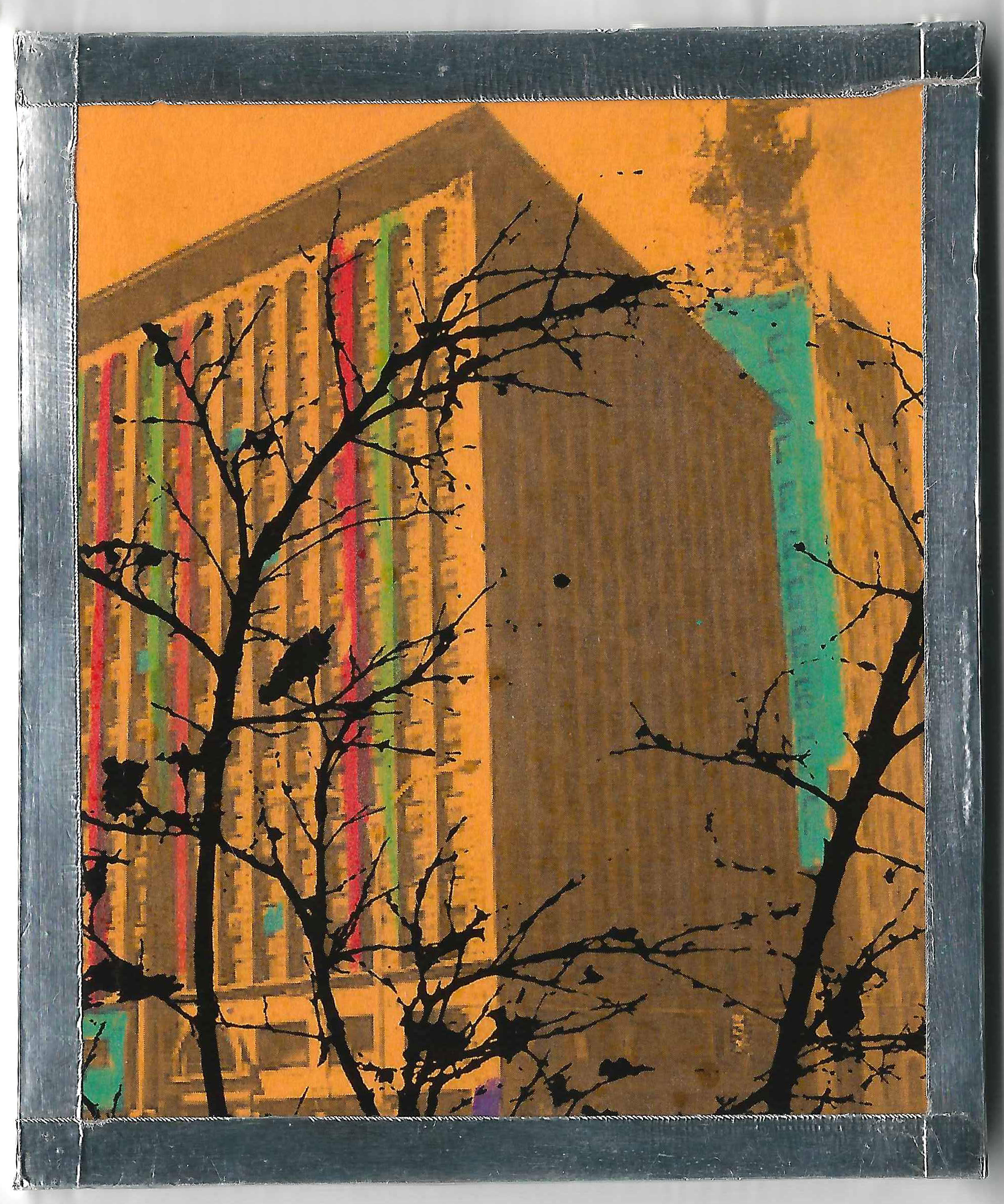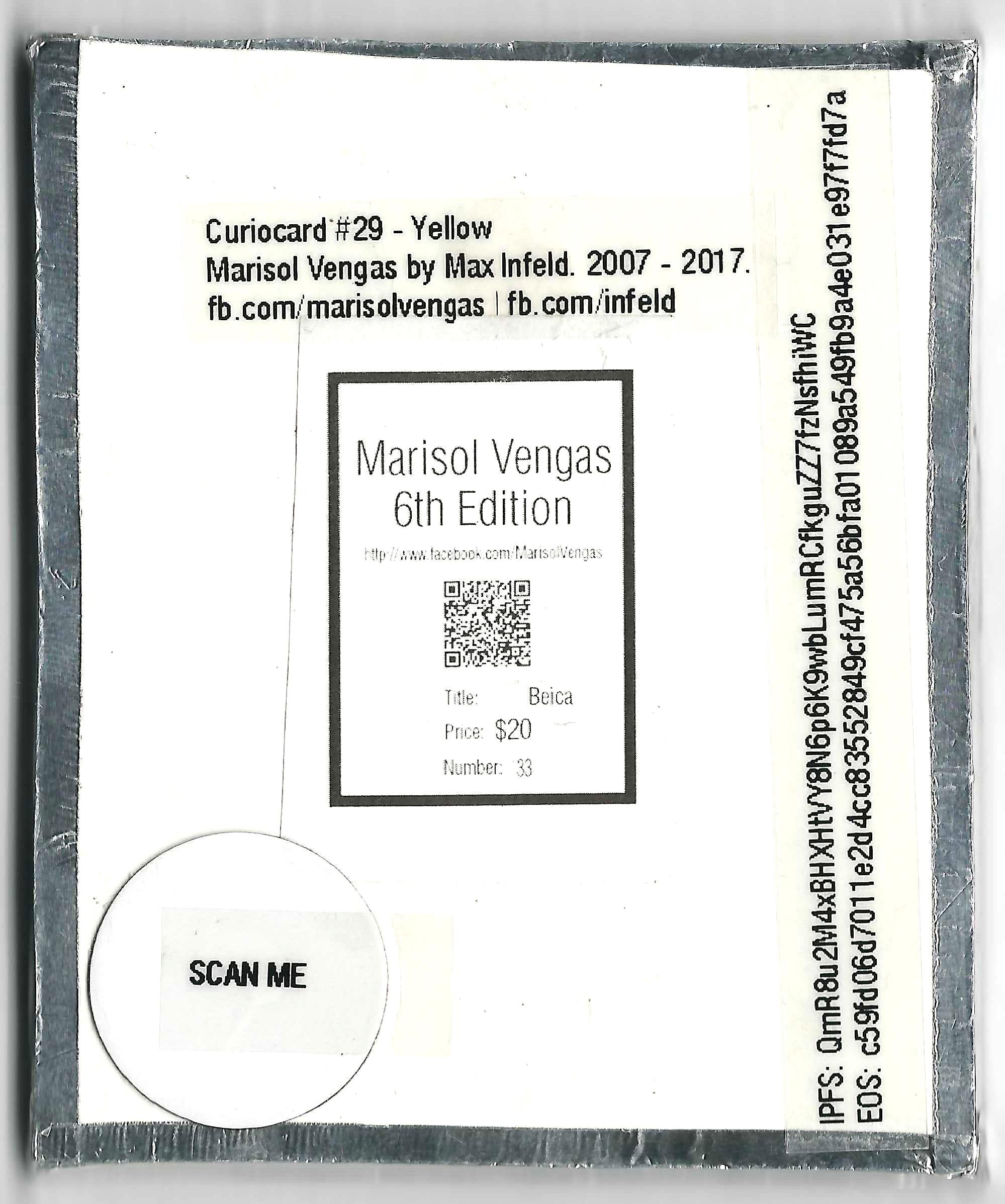 Yellow 29 was created through a community algorithm approach. Participants collected images, colored geometric forms, cropped plant and figure transparencies, and clipped together trial compositions. From these studies, Max Infeld curated, corrected, and assembled the final artwork with adhesive on foam core and metallic tape. Printed on neon cardstock and layered with transparency imagery, the piece stands out for bold composition and depth. The physical original preceded the NFT and connects directly to the Curio Cards project.