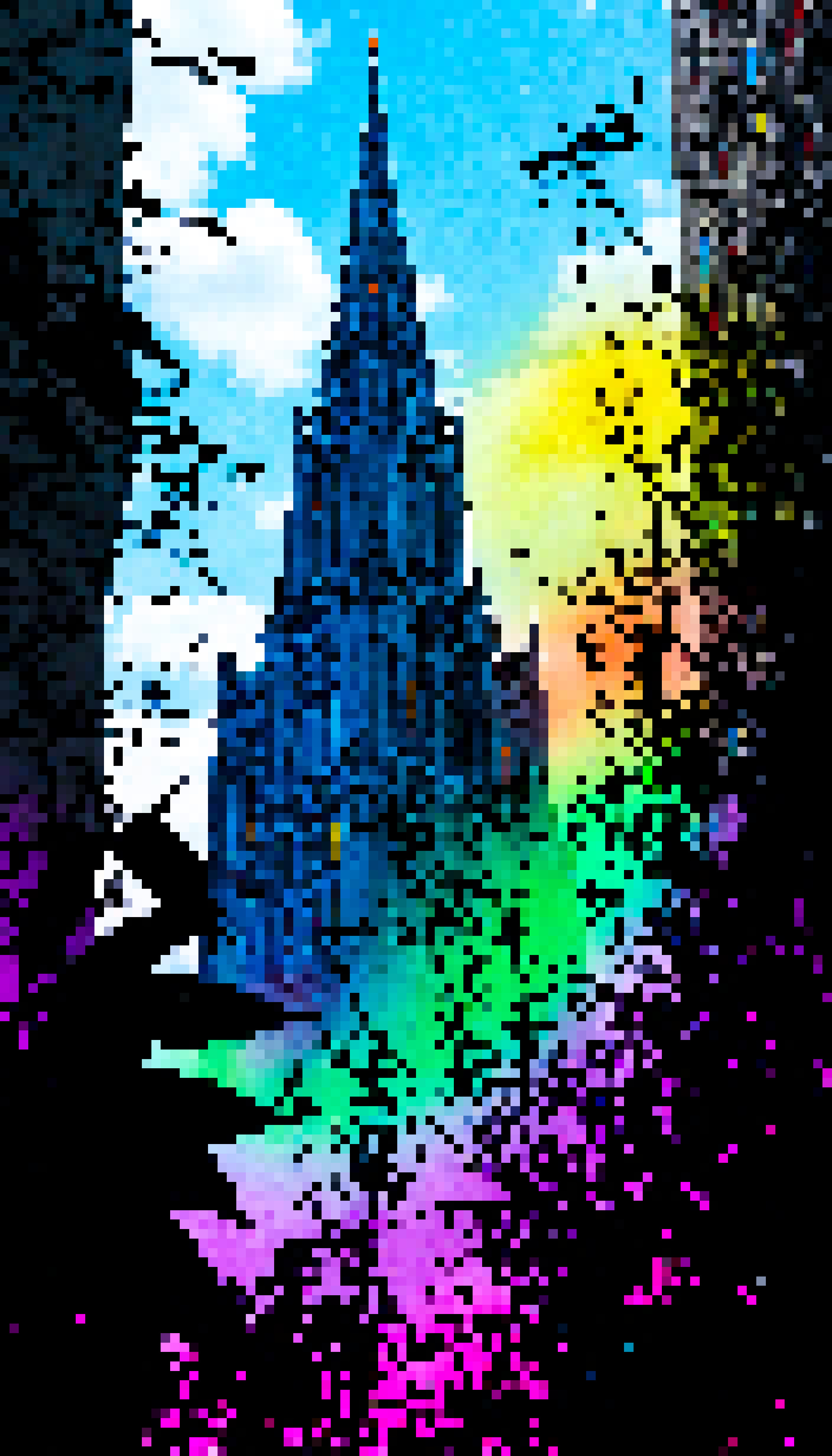 The style of the image combines elements of nature (the rainbow) and architecture (the cathedral) creating an intriguing juxtaposition. There is no visible text within the image to provide additional context or information.