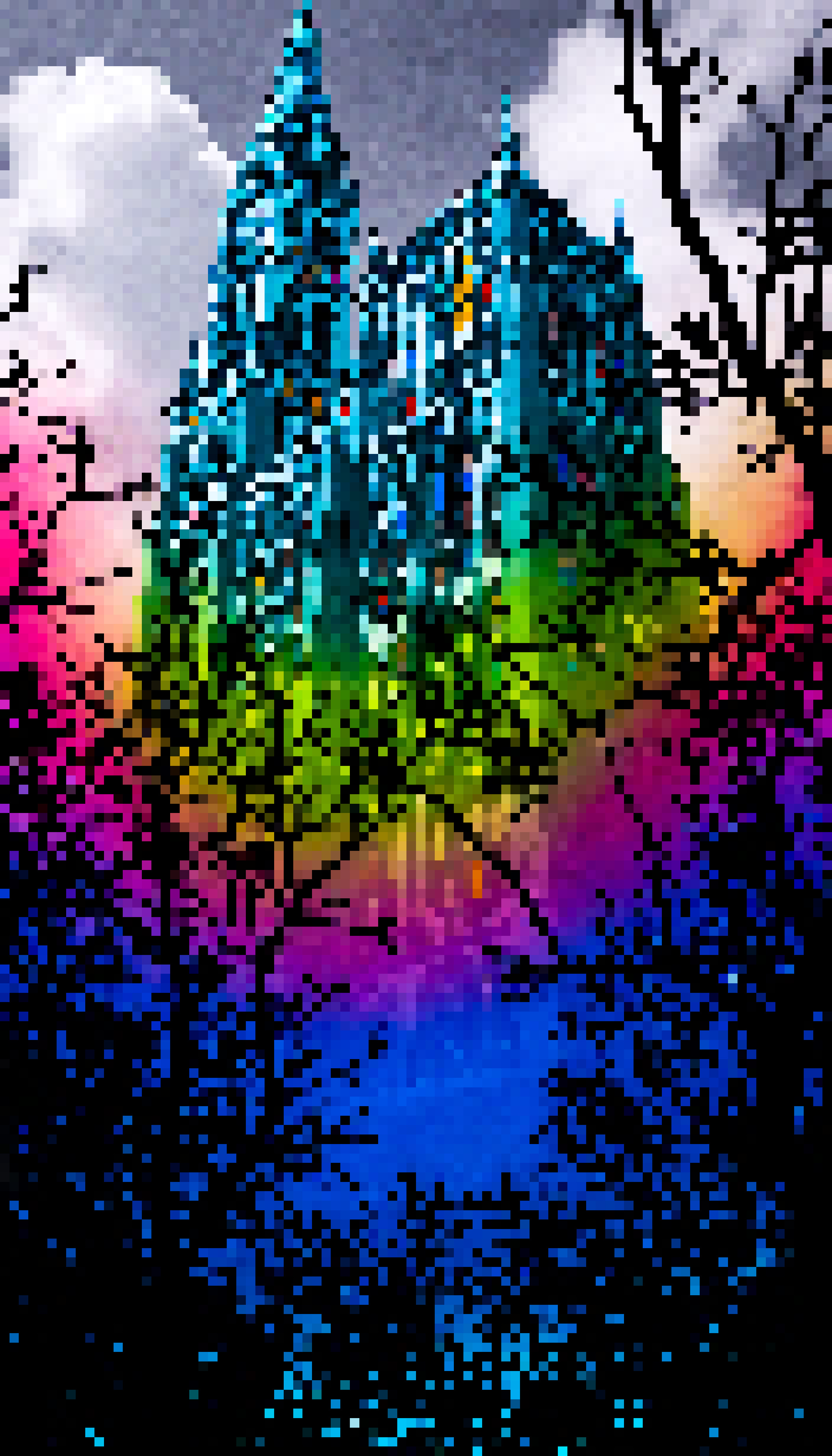 The image presents a captivating view of St Patrick's Cathedral a renowned landmark in Ireland. The cathedral stands majestically in the background its architectural details clearly visible against the backdrop of a cloudy sky. The foreground is dominated by a vibrant display of colors predominantly blue and purple hues that add a mystical quality to the scene. A rainbow often associated with hope and positivity stretches across the image creating a striking contrast with the cathedral's solemn presence. The cathedral itself is not visible in its entirety; instead only a small portion of it is shown allowing for an intriguing perspective on this world-famous structure. This juxtaposition of elements creates a visually engaging image that merges the realms of nature and architecture.
