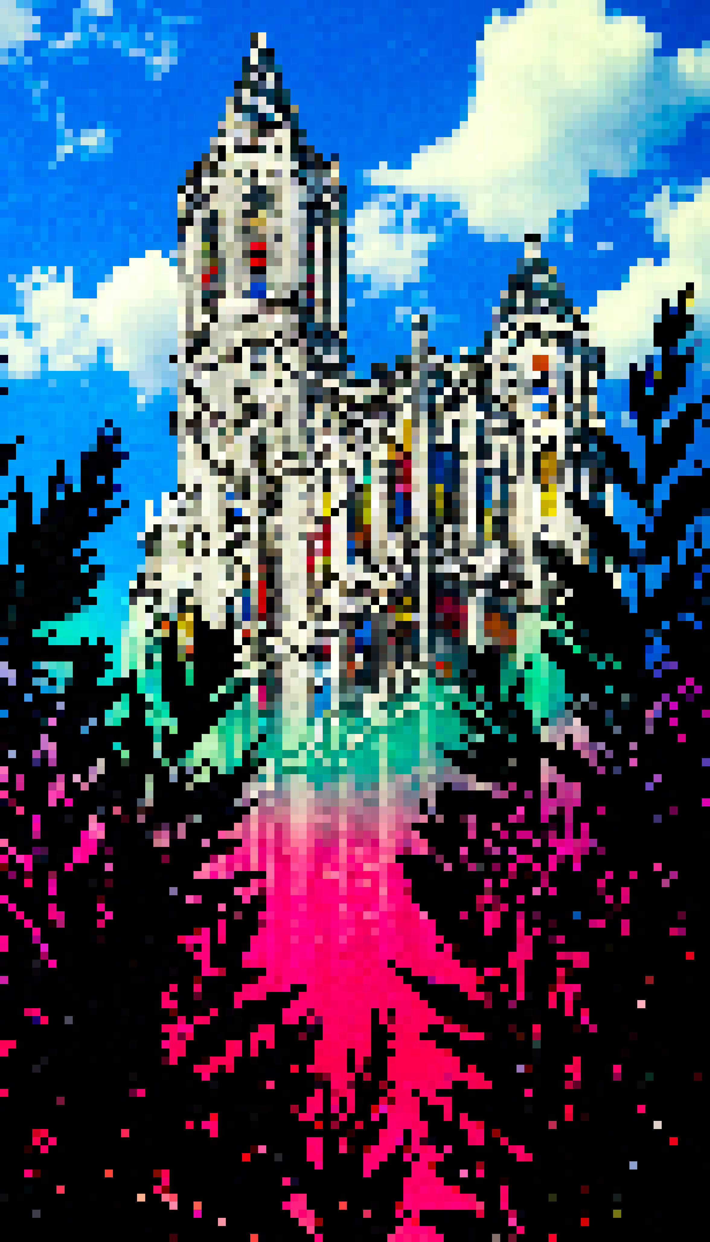 The image is a digital collage with two distinct sections. On the left there's an illustration of a castle-like structure which resembles a European cathedral. The architecture includes multiple turrets and arches suggesting it could be a historic building. The right side of the image features a vibrant psychedelic background with swirling patterns in shades of pink and purple creating a contrast against the grayscale illustration on the left. The overall style of the image is modern and Marisolic blending elements of history with contemporary graphic design.