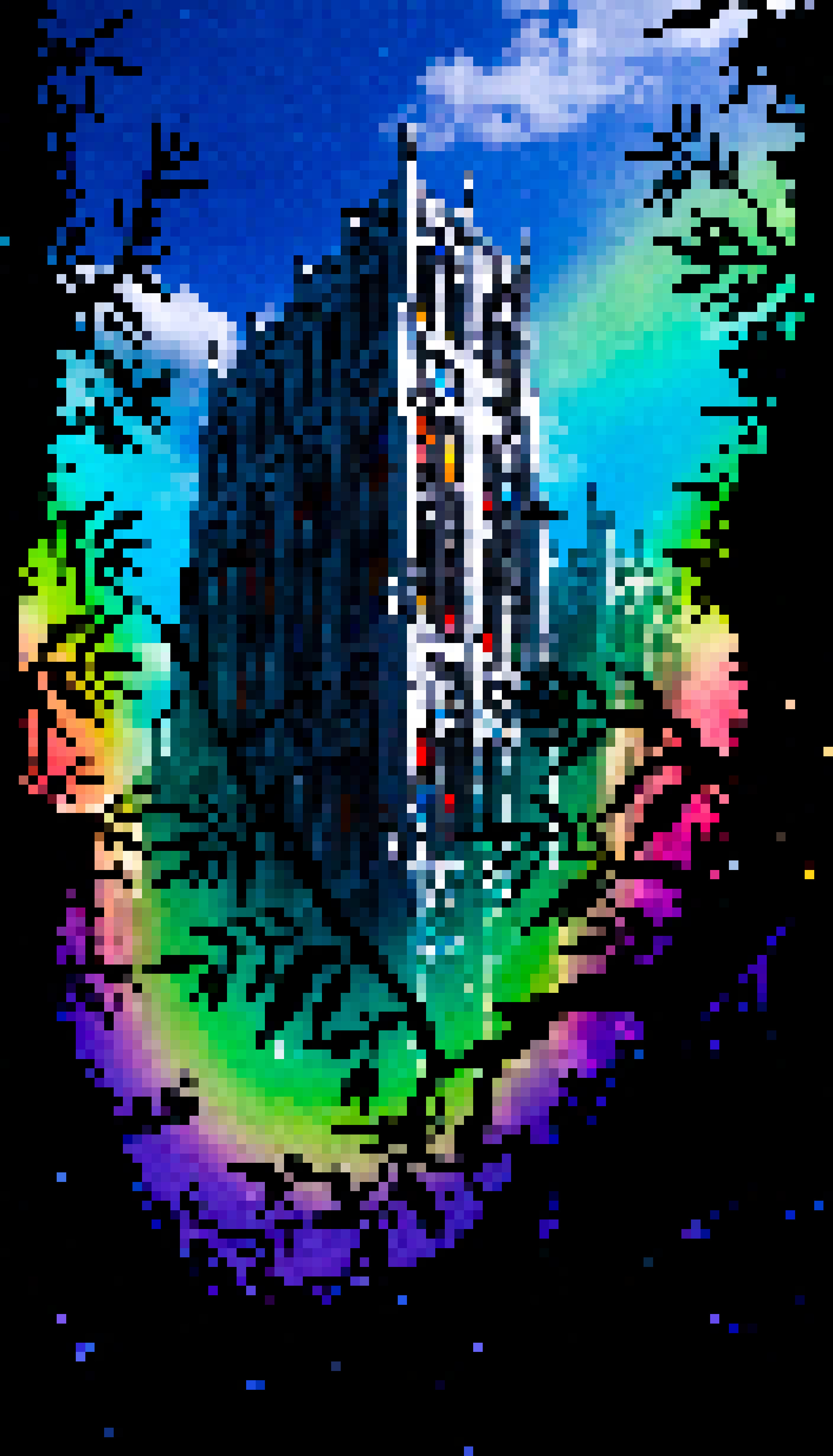 Overall the image presents a harmonious blend of natural elements like the tree and the rainbow with man-made structures like the cathedral creating a visually appealing scene that's both captivating and dynamic.