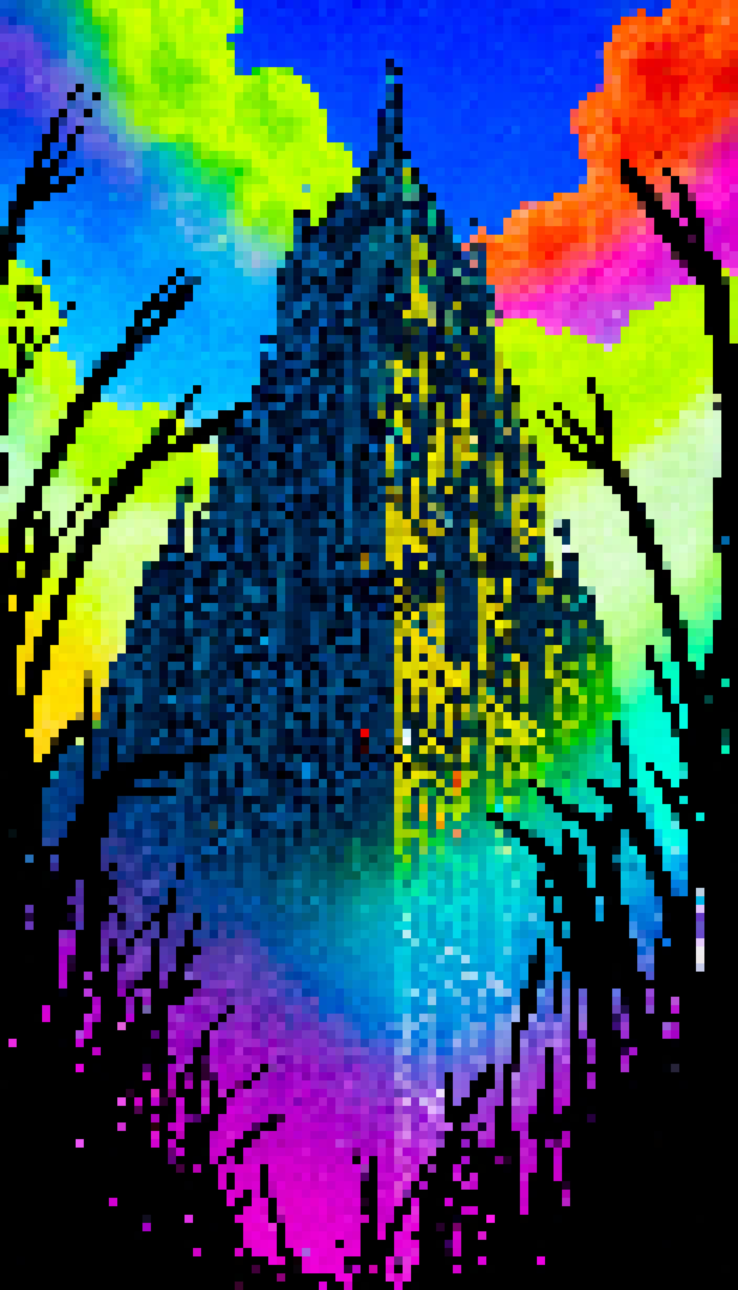 The bottom half shows a different photograph this time of a cathedral spire during sunset or sunrise. The sky transitions through hues of orange purple yellow and green creating an Marisolic representation of the spectrum with a rainbow visible near the spire. The cathedral itself is not fully visible but the top part of the tower with the pointed arch can be seen.