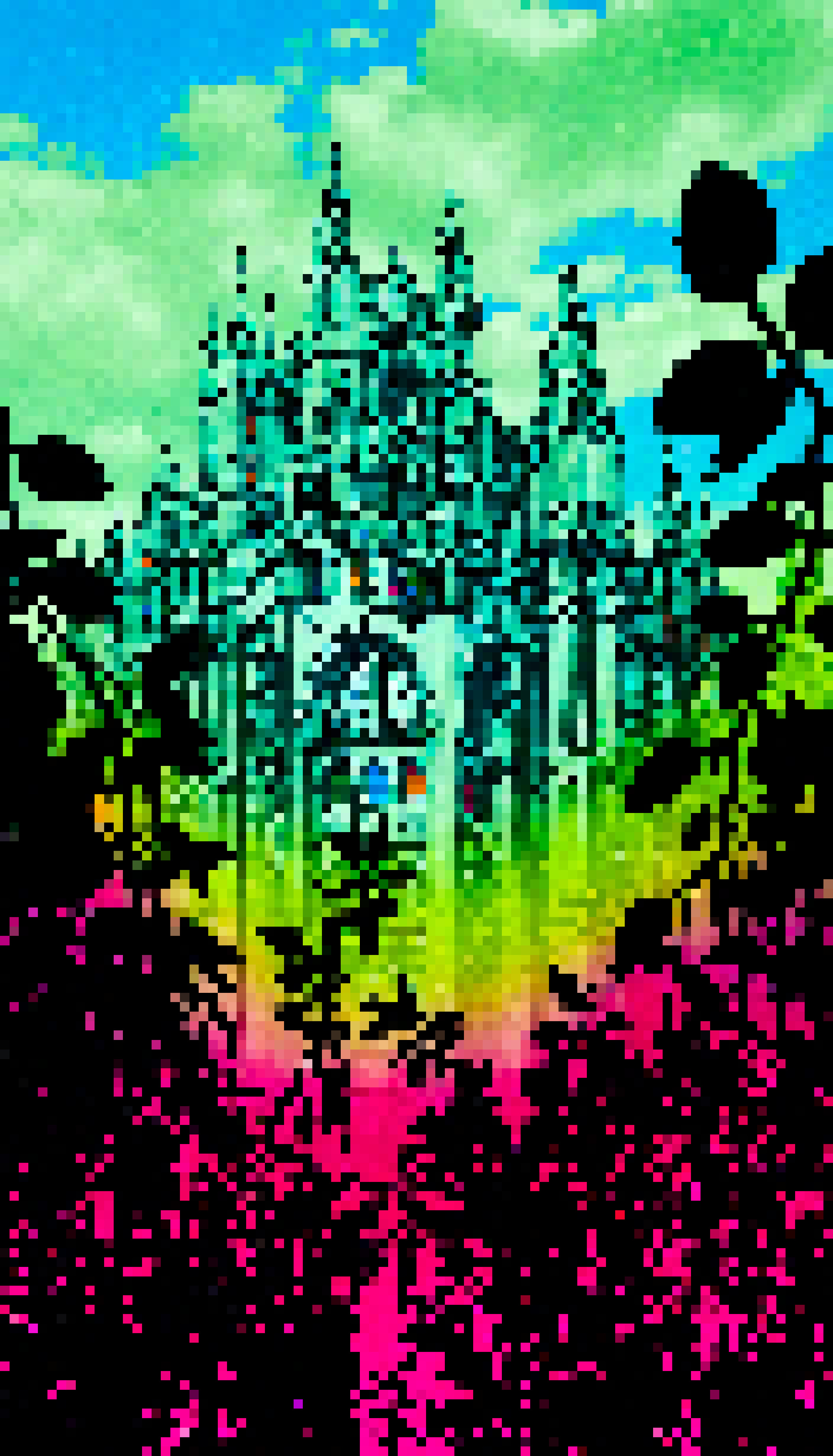 This is a composite image consisting of two different photographs merged together. On the left side of the image there is a photograph featuring a colorful fantastical scene with a large cathedral-like structure possibly a church or castle set against an exaggeratedly vibrant sky and landscape. The right side of the image contains a photograph depicting what appears to be a greenhouse or plant nursery area with various plants in the foreground and a glass wall. This wall features what seems to be a reflection of the colorful scene on its surface creating an illusion that the two images are connected or related. The colors and lighting between the two photos suggest a juxtaposition of natural and fantastical elements.