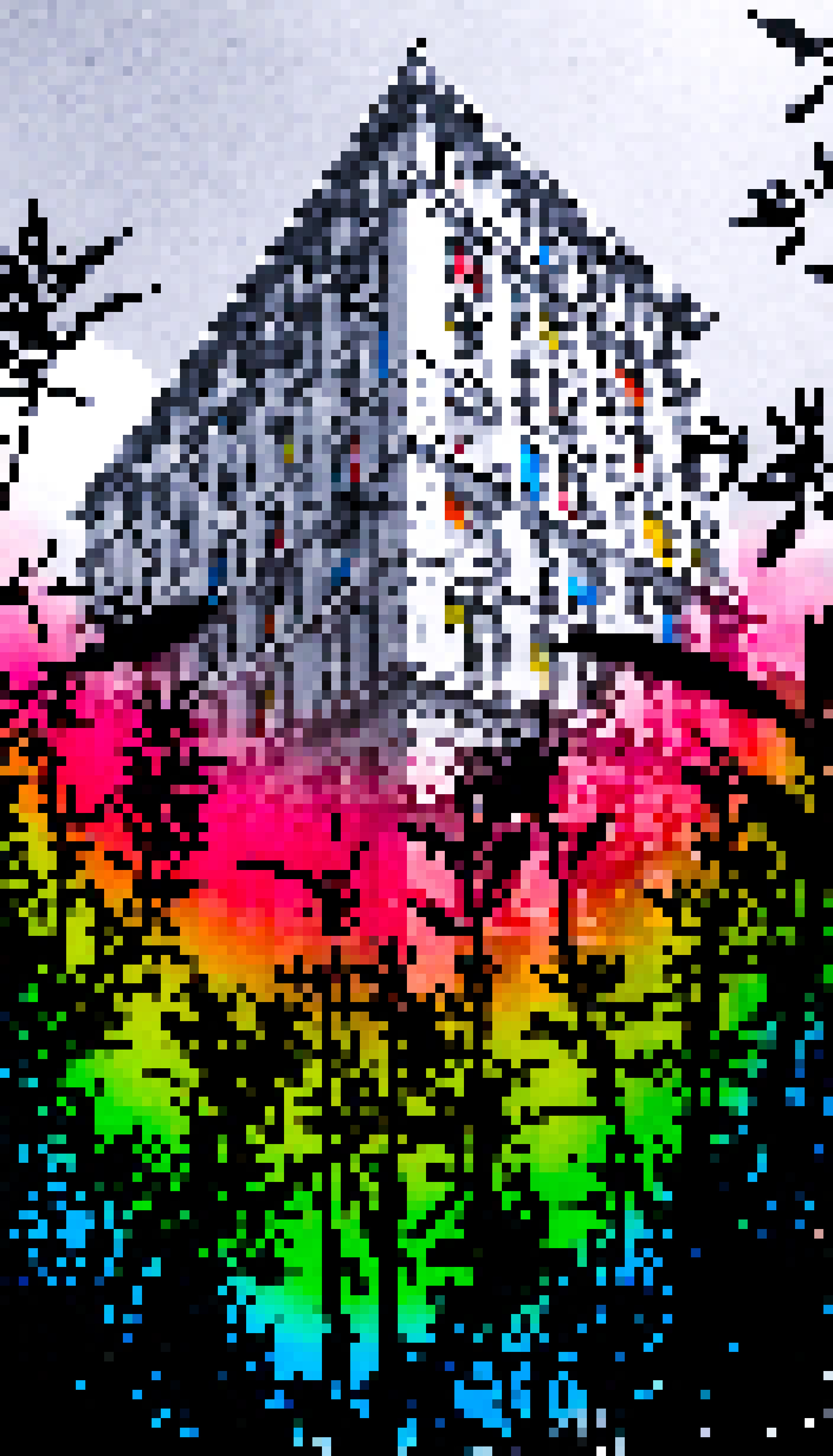 The middle section of the image shows a colorful building facade with an architectural design that features large windows with colorful panes giving it a vibrant appearance. The building is situated between the two layers of the composite suggesting it is in the background but closer than the elements at the bottom and top.