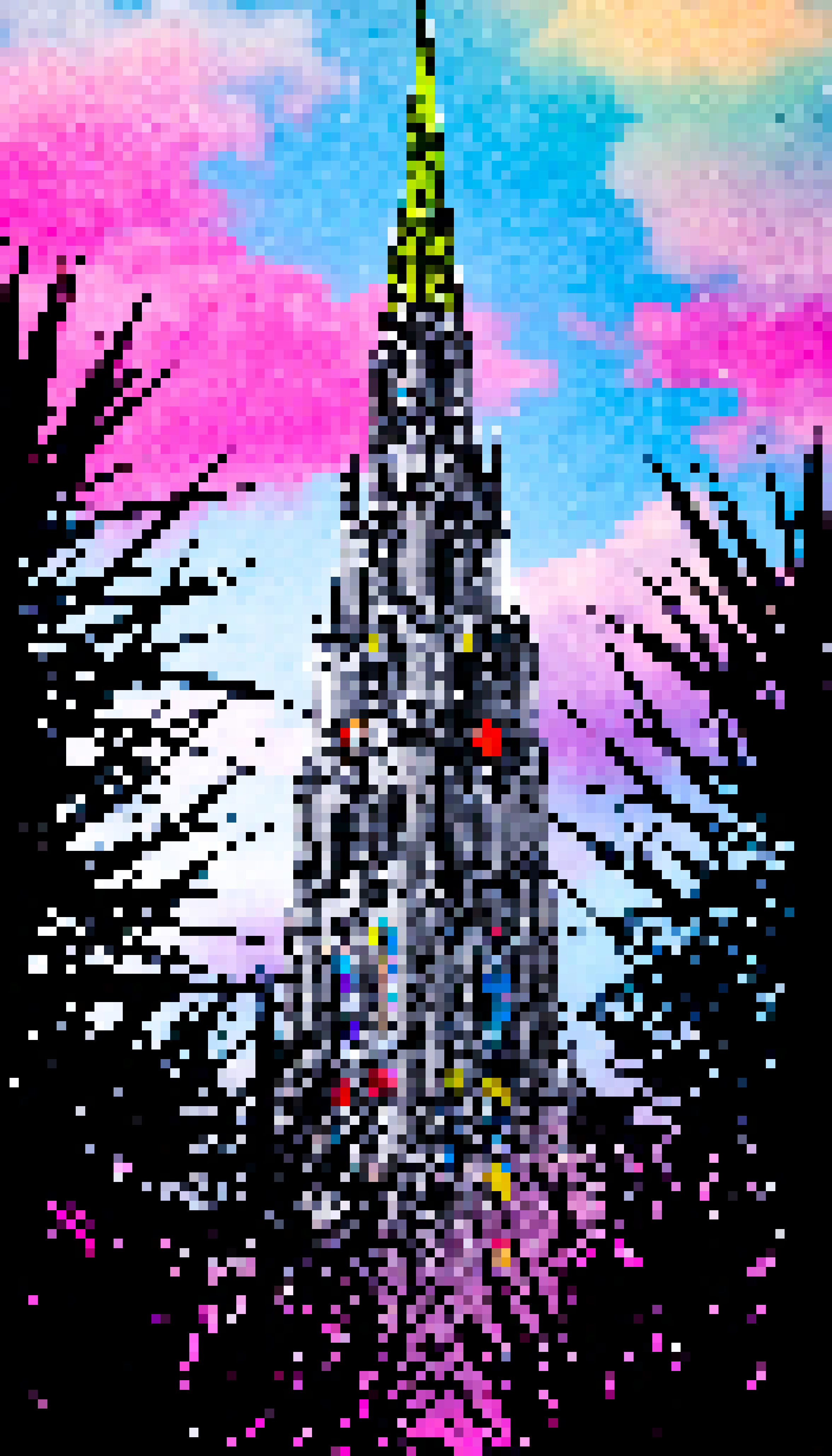 The background of both halves is painted in shades of pink and purple providing a vibrant backdrop that enhances the overall composition. The contrast between the serene cathedral and the lively carnival creates a unique blend of colors and elements making the image quite captivating.