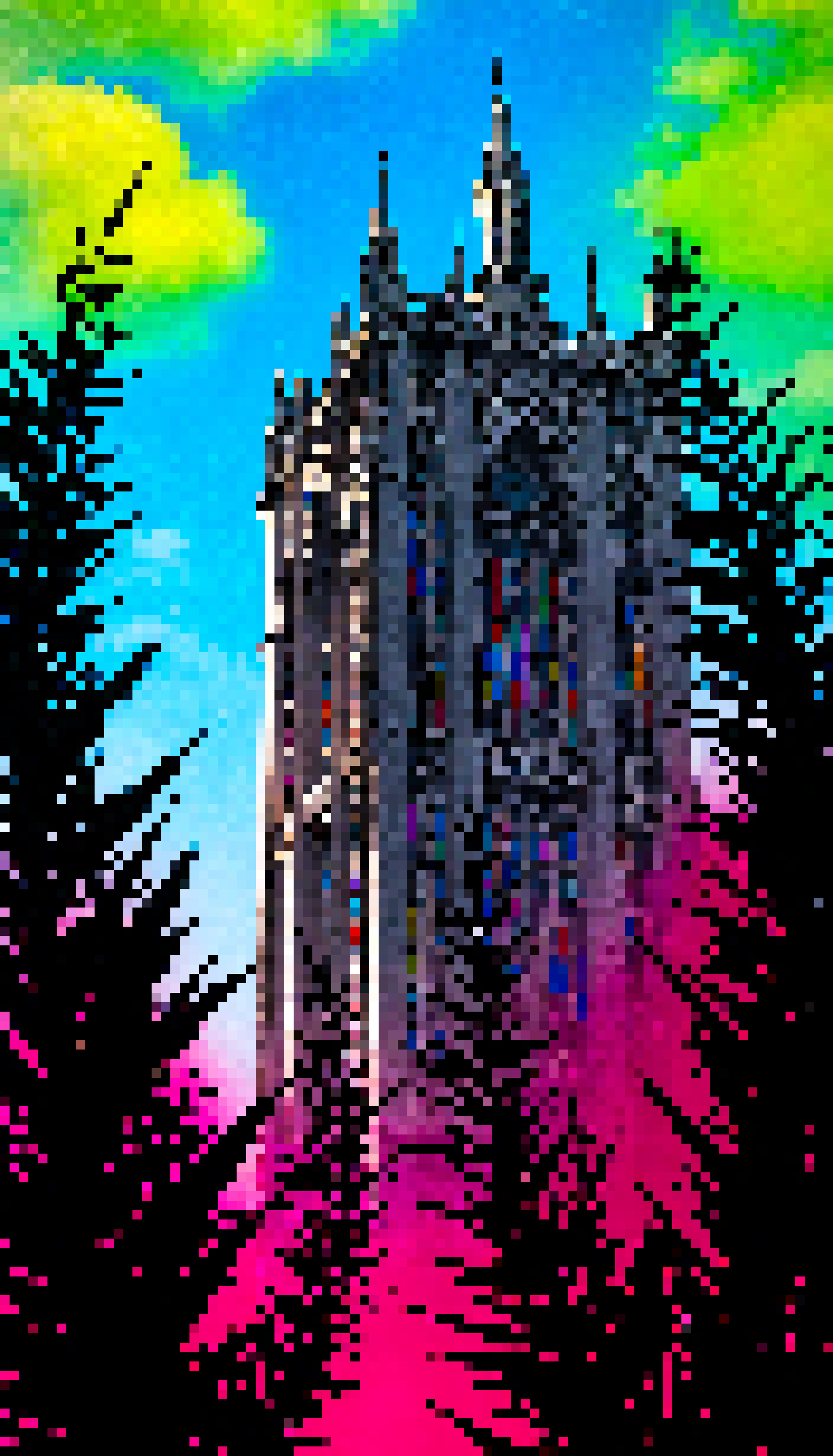 The image is a composite of two photographs which are vertically aligned and display two different scenes. On the left side there's a vibrant landscape featuring a tall tower with multiple spires that reach into a clear blue sky. The tower's facade is adorned with colorful stained glass windows in shades of red yellow green purple and pink which cast a rainbow spectrum onto the surrounding greenery predominantly consisting of tree leaves and branches.