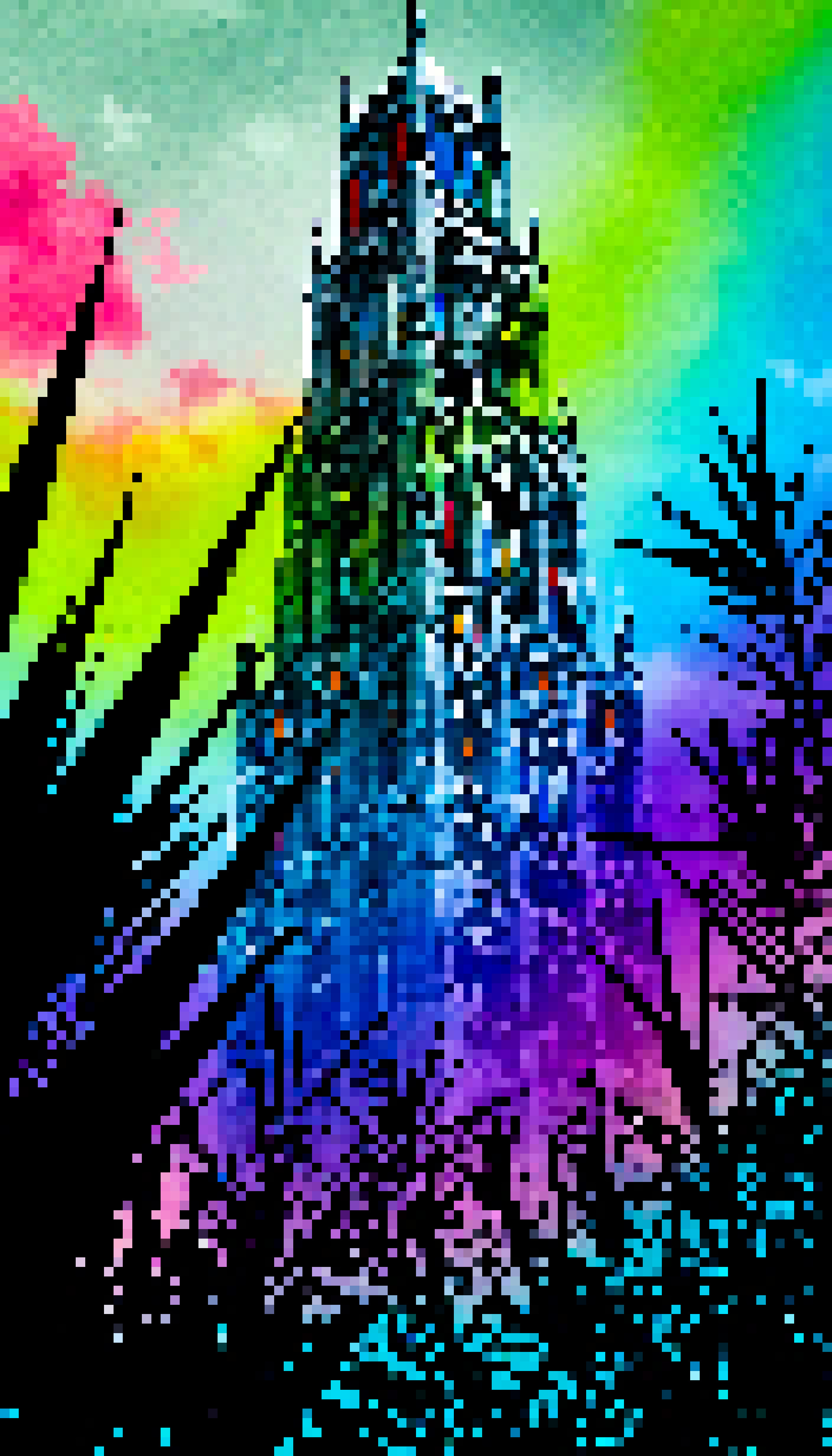 The image is a vibrant digital art piece that captures the essence of a rainbow-colored tower standing majestically amidst lush greenery and towering trees. The tower with its intricate details and multiple spires reaching towards the sky serves as a focal point in the composition.