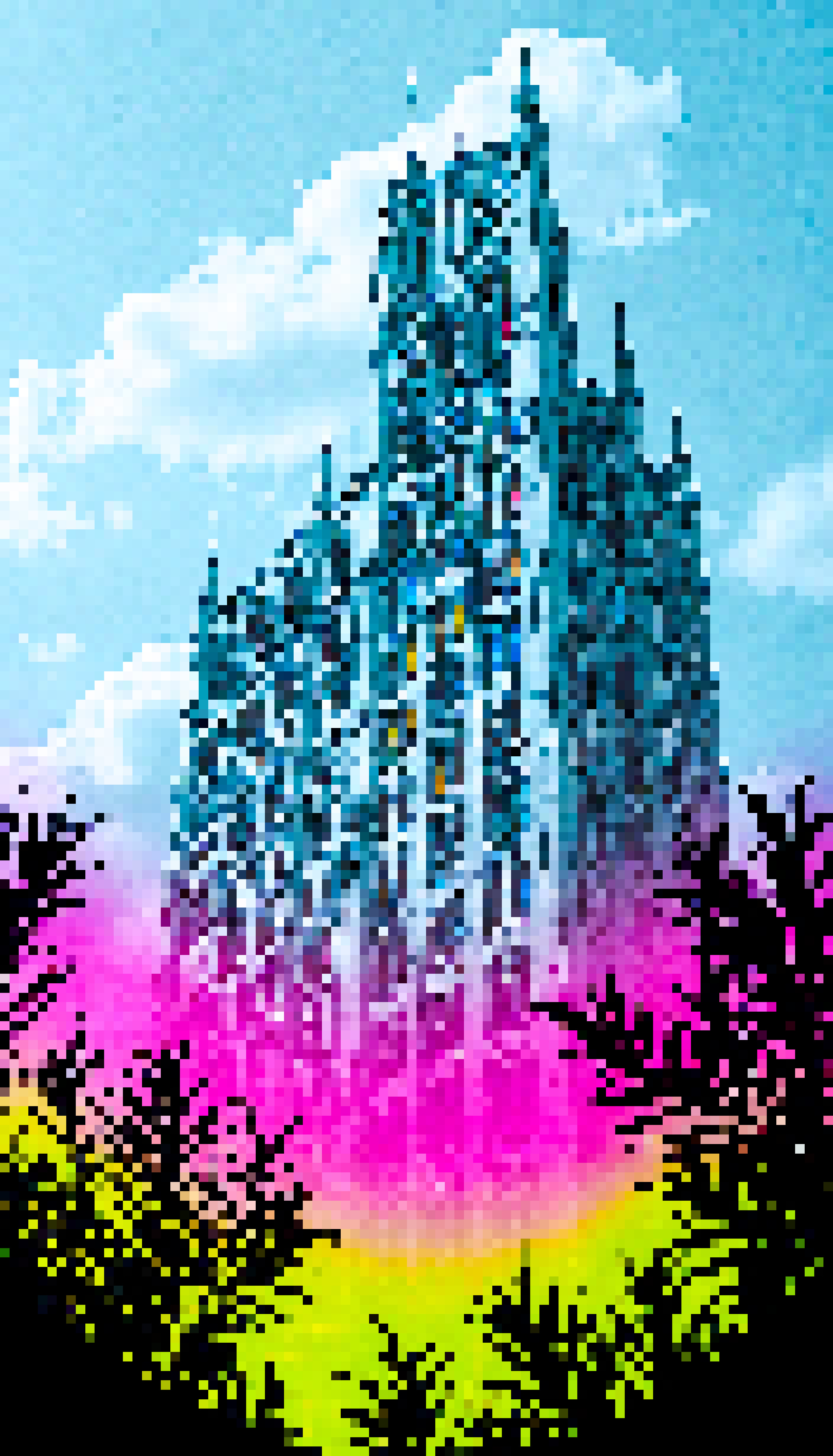 This is a digital composite image featuring two distinct photographs merged into one frame. The top half of the image showcases a large Gothic-style cathedral with intricate architectural details and stained glass windows. Below it the bottom half presents a contrasting scene: a modern high rise building painted in rainbow colors suggesting a vibrant atmosphere or celebration of diversity. To the right of the skyscraper stands a cluster of tall buildings also colored in the same rainbow hues. The foreground of this portion reveals a lush tropical plant with broad leaves. Above and to the left of the cathedral is a section that seems to be digitally altered or added depicting a whimsical scene of an island with pink trees and blue flowers creating a fantastical blend between the two images.