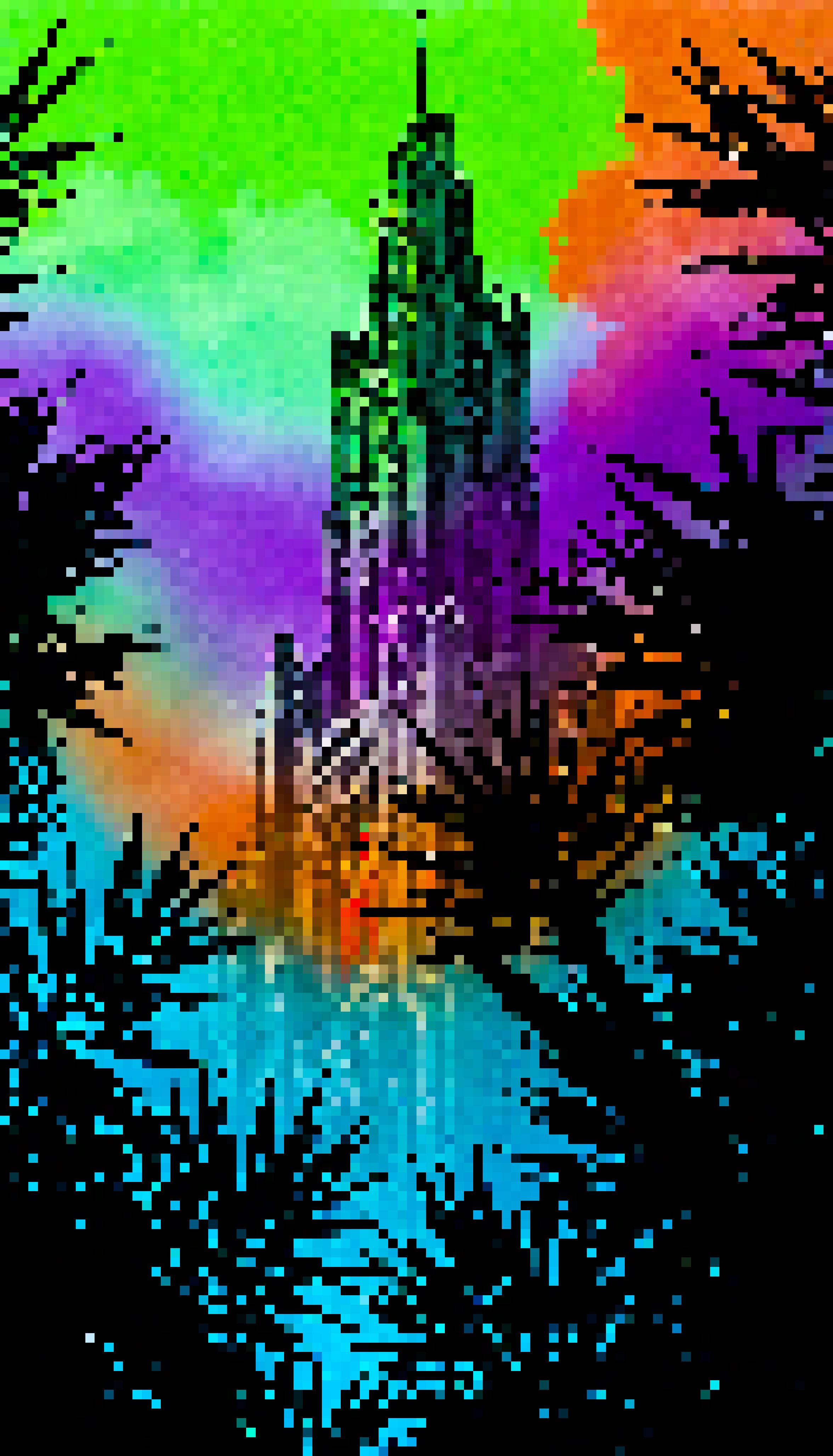 The image is a digital art creation that features a vibrant city skyline at night set against the backdrop of a colorful sunset or sunrise with hues of purple and pink blending into orange and yellow as they reach the horizon. In the foreground on the left side there is a vertical strip that seems to be digitally inserted obscuring the view of the skyline. This strip displays a green gradient from top to bottom creating an illusion of vegetation or foliage. Through this green veil only parts of the skyline are visible including what appears to be a tall tower with a spire and several windows at its base partially obscured by the green strip. The tower stands out against the colorful sky. The style of the image is reminiscent of a digital collage or a manipulated photograph with elements added digitally.
