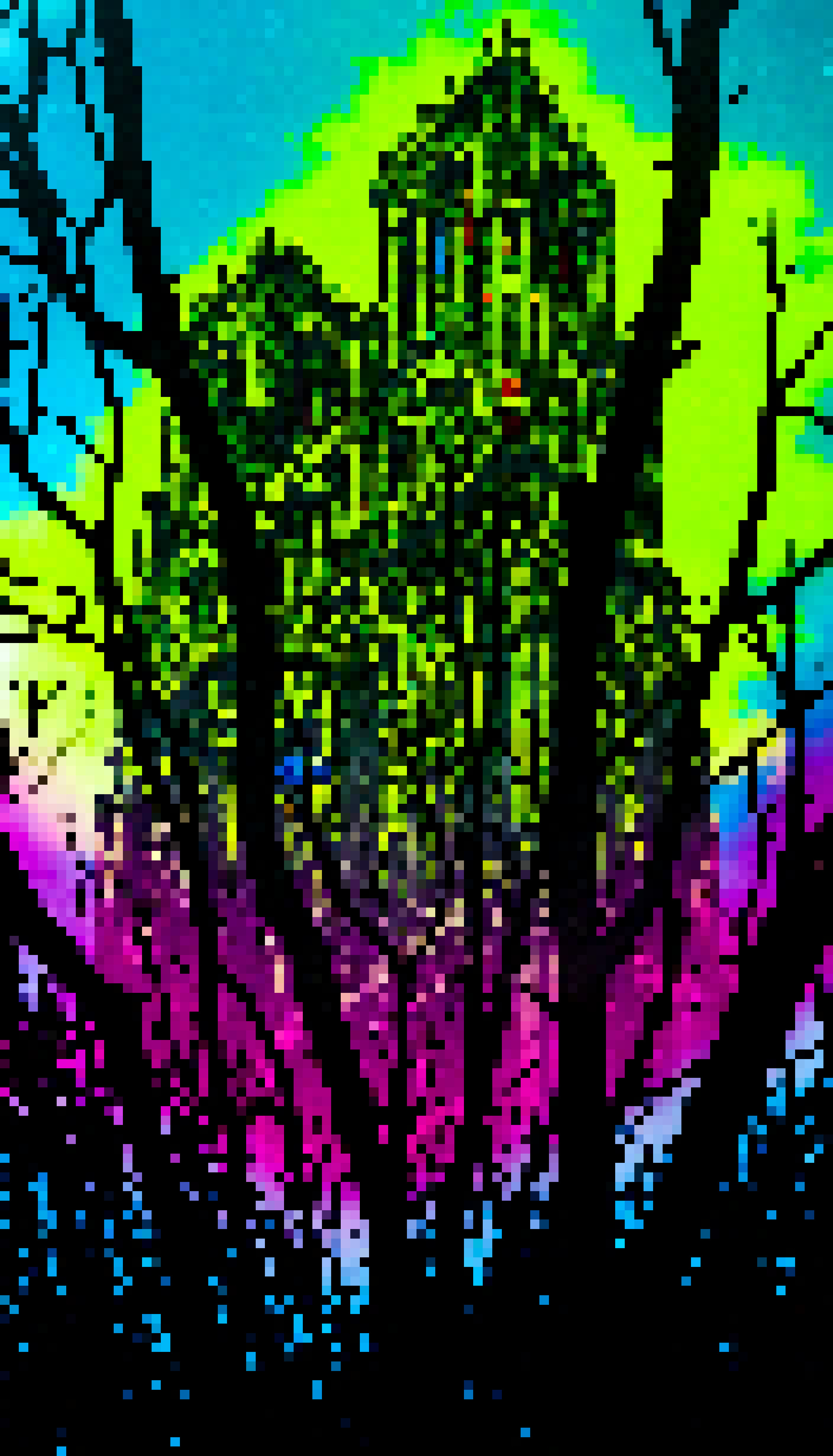 The cathedral itself is illuminated from within with several windows glowing suggesting that it might be lit up for a special event or simply because of its architectural features. The colors used in the artwork include shades of green yellow and purple which add to the fantastical and dreamlike quality of the illustration.