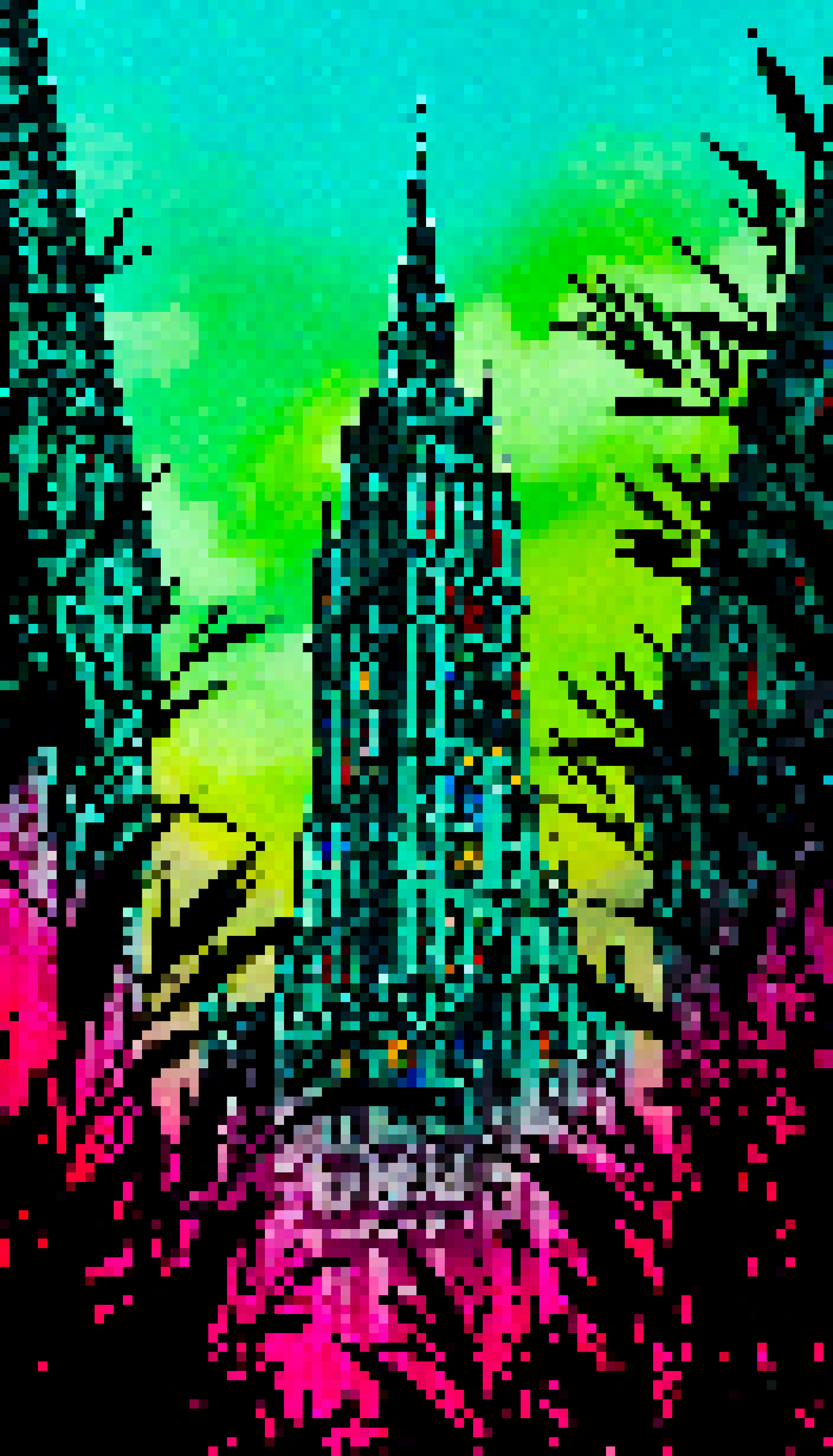 The image appears to be a digital art piece with an illustration style. In the foreground there is a vibrant mix of colors overlaying a realistic cityscape featuring a tall tower with pointed spires and windows. To the right side partially obscured by foliage there is a building with a classical architectural design possibly a church or an old castle-like structure. The tower's colors range from yellows to greens creating a contrast with the more muted tones of the surrounding buildings. The image has a split-screen effect where two distinct halves are connected by a black line at their center dividing the upper portion with the tower and lower portion showing a dense cluster of plants or bushes. The plants appear to be thriving in an urban environment with some leaves exhibiting vibrant colors. The background is a plain gradient from green on the left to purple on the right. There are no texts visible in the image.