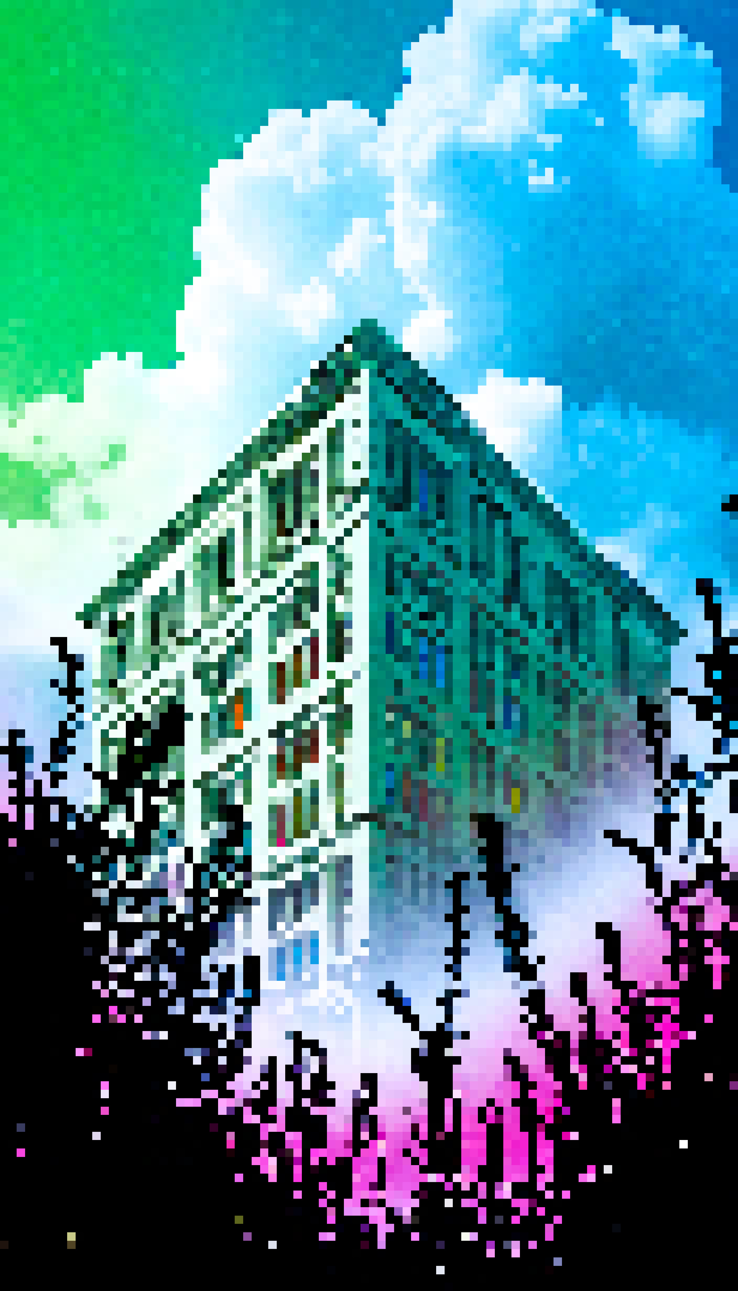 The right half of the image which is cropped features a vibrant and colorful scene. It depicts a sky filled with clouds in shades of pink purple and blue. There is no visible text or labels on this portion of the image. The transition between the two photos creates a stark contrast in both subject matter and style.