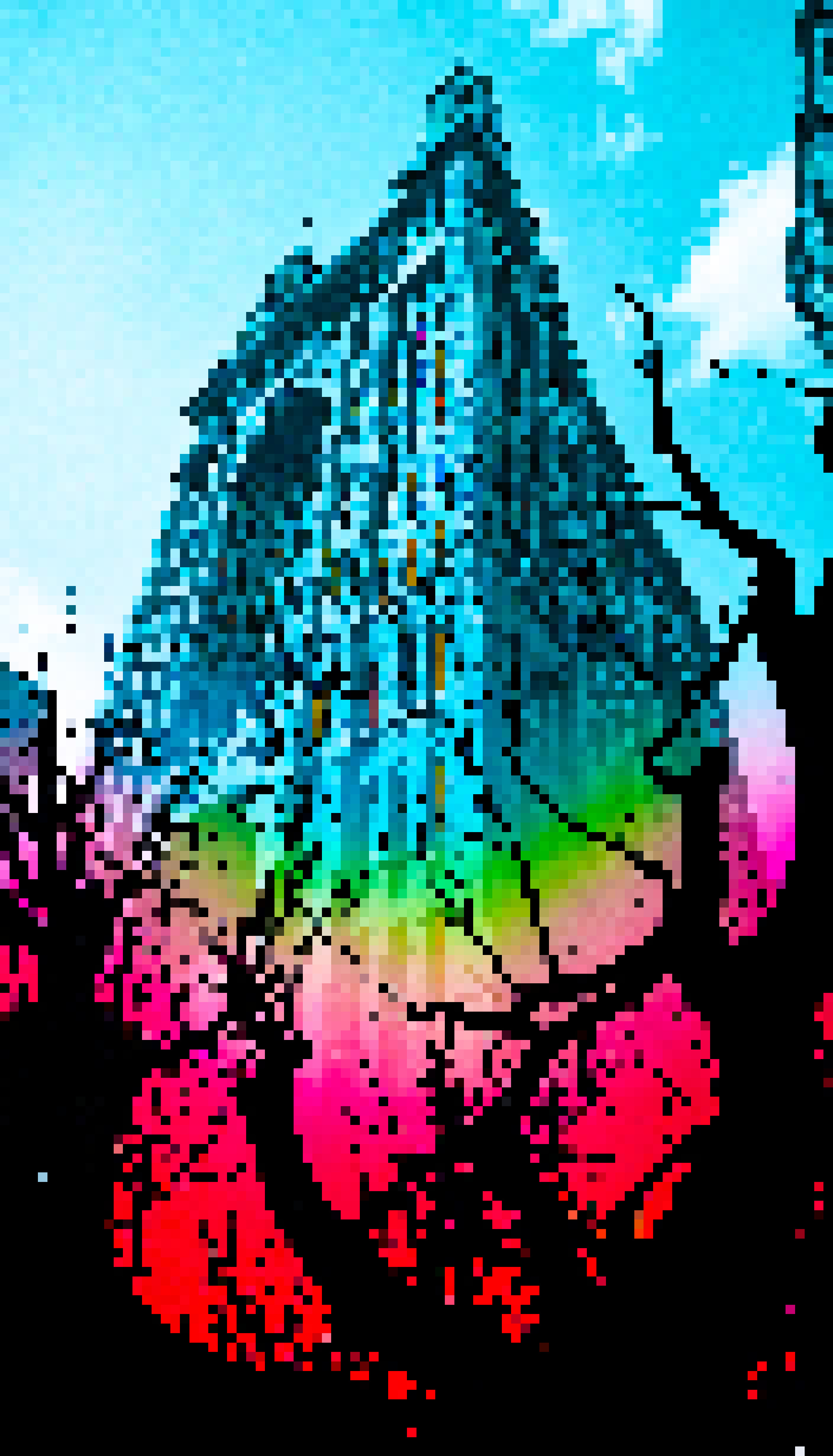 This is a digitally altered photograph showing an urban scene with the skyscraper "The Peace Tower" prominently in the background. The tower which has a distinctive clock face is adorned with stained glass windows of various hues. In the foreground there are trees with bare branches that appear to have been digitally colored in shades of pink and purple adding an unusual and vibrant element to the scene. The image also includes a rainbow effect which seems to emanate from the base of the tower extending downwards into the lower left corner of the photo. The sky is partially visible at the top of the image showing clear blue with clouds scattered across it.