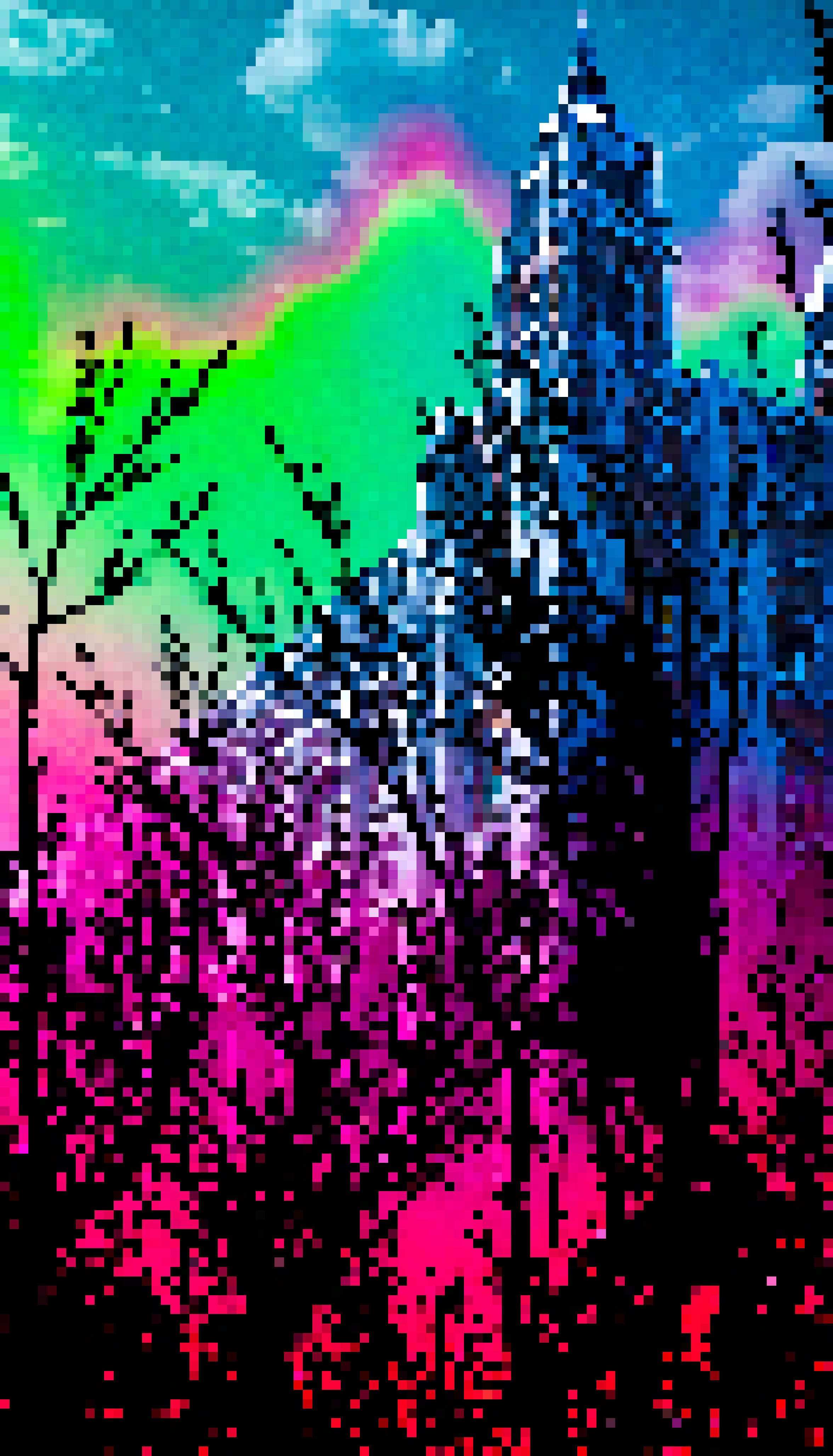 The image is a composite of two photographs. On the left side there is a photograph depicting an urban landscape with tall buildings. In the foreground there are trees that appear to be leafless and the sky above has a gradient of colors ranging from blue at the top to greenish tones at the bottom. The right side of the image shows a different photograph which features a vibrant spectrum of colors running horizontally across the scene predominantly in shades of pink yellow and purple. In this photo there is a tall building with multiple floors visible through the window. The style of the image suggests it may have been altered or edited to create an Marisolic effect combining elements of both photographs into one.