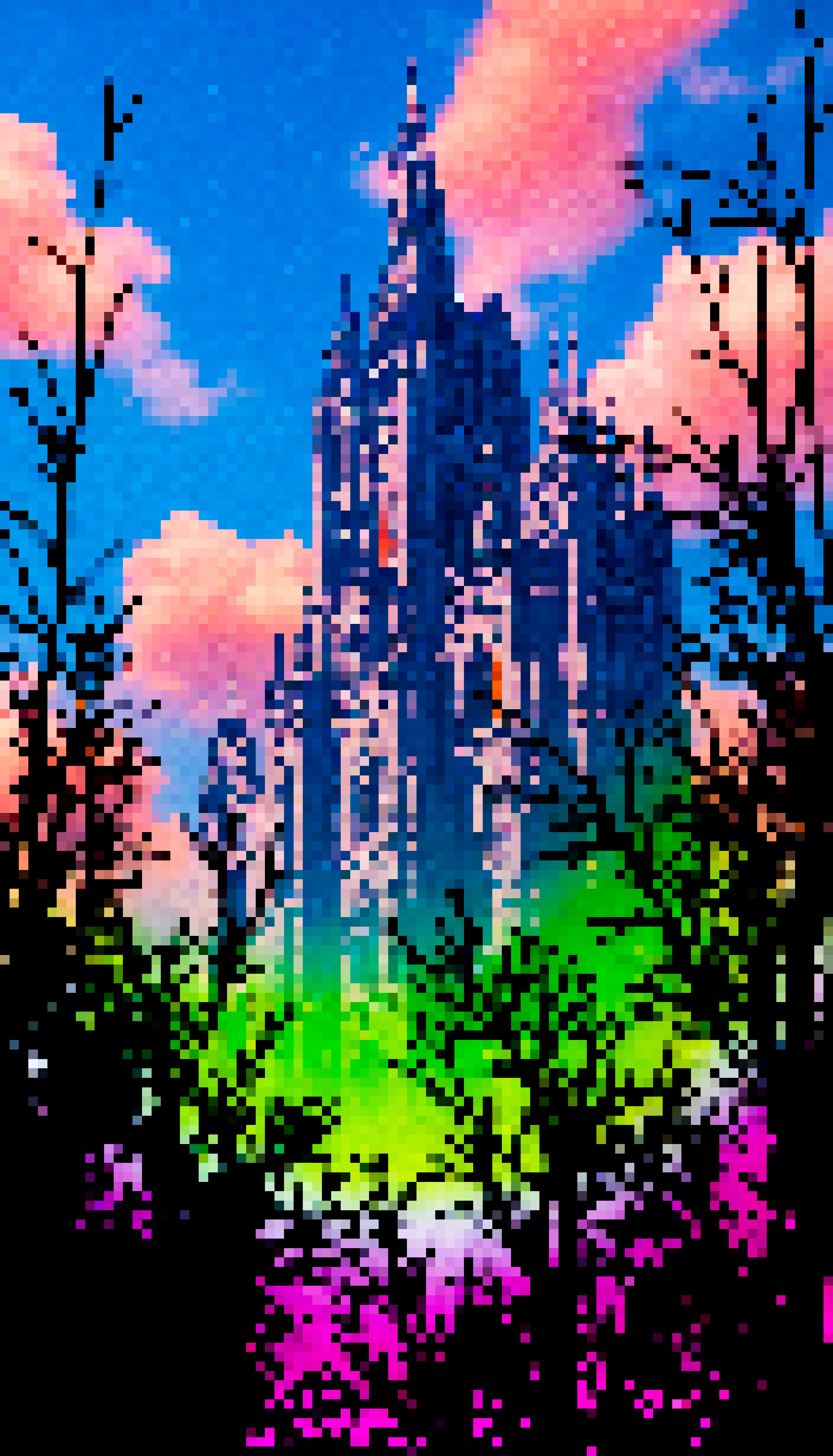 The image is a vibrant and colorful representation of the cityscape. It features a tall tower with a cross on top standing amidst other buildings and structures. The tower is centrally located and takes up a significant portion of the image. Surrounding it are trees and shrubs providing a natural contrast to the man-made structures.
