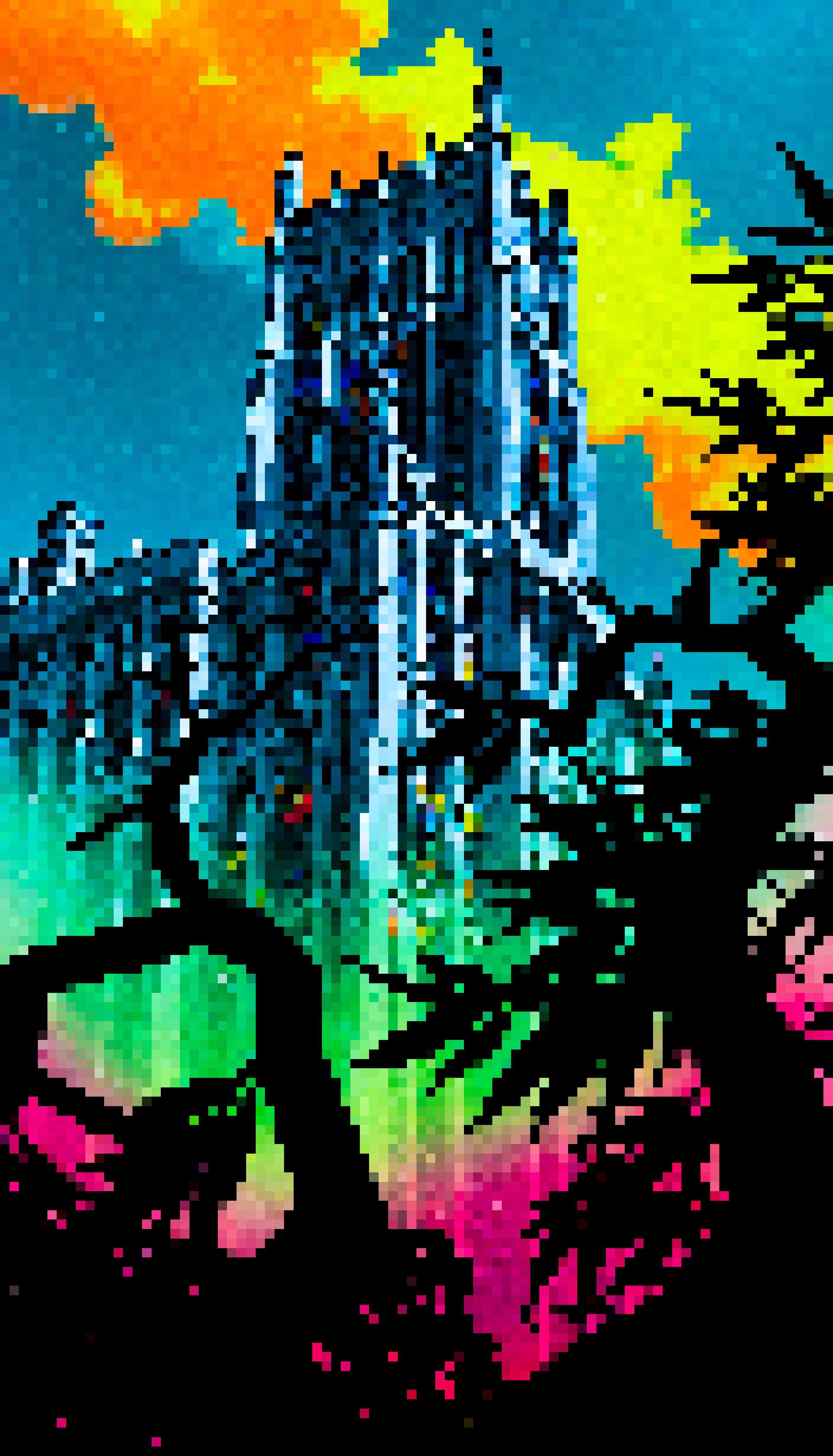 In the bottom right corner the silhouette of a tree stands tall its branches reaching out towards the viewer. The tree's presence adds a touch of nature to this urban landscape.