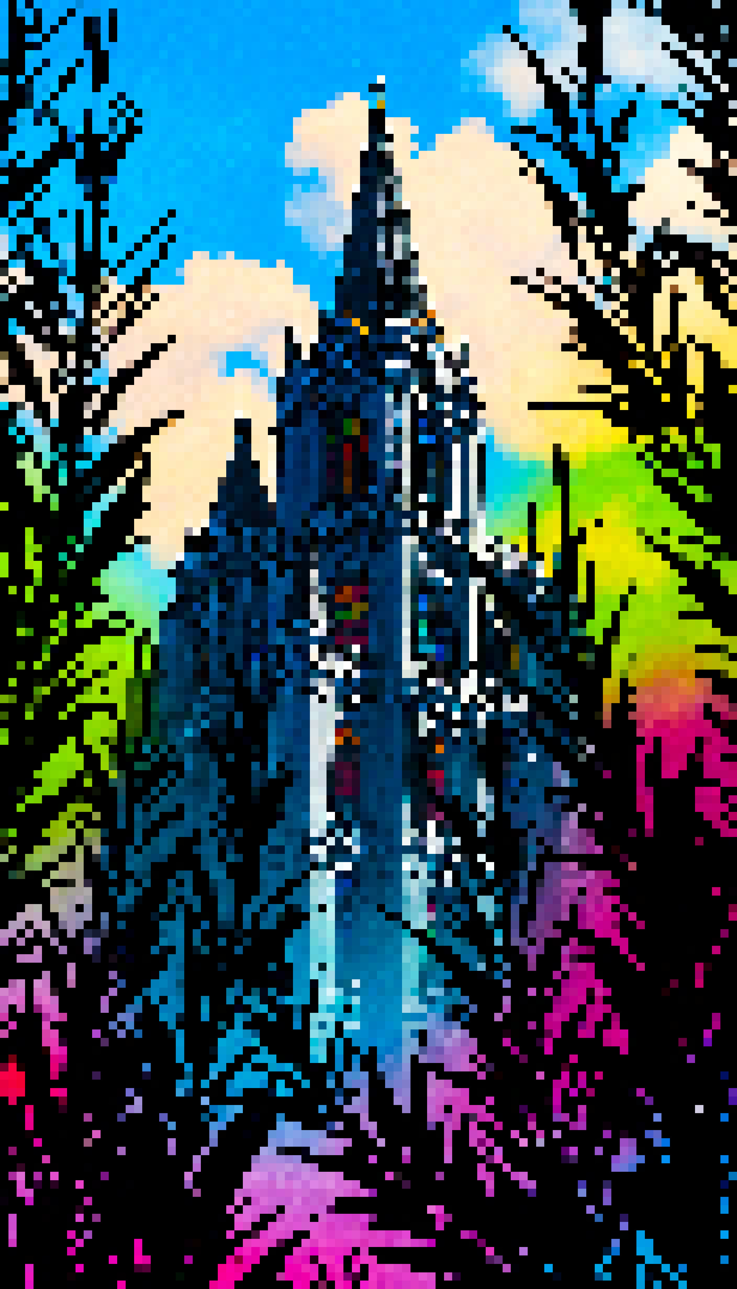 The cathedral's spire reaches towards the sky while two towers flank it adding to its grandeur. The cathedral is partially obscured by overgrown vegetation giving the impression that it has been forgotten or neglected for a long time.