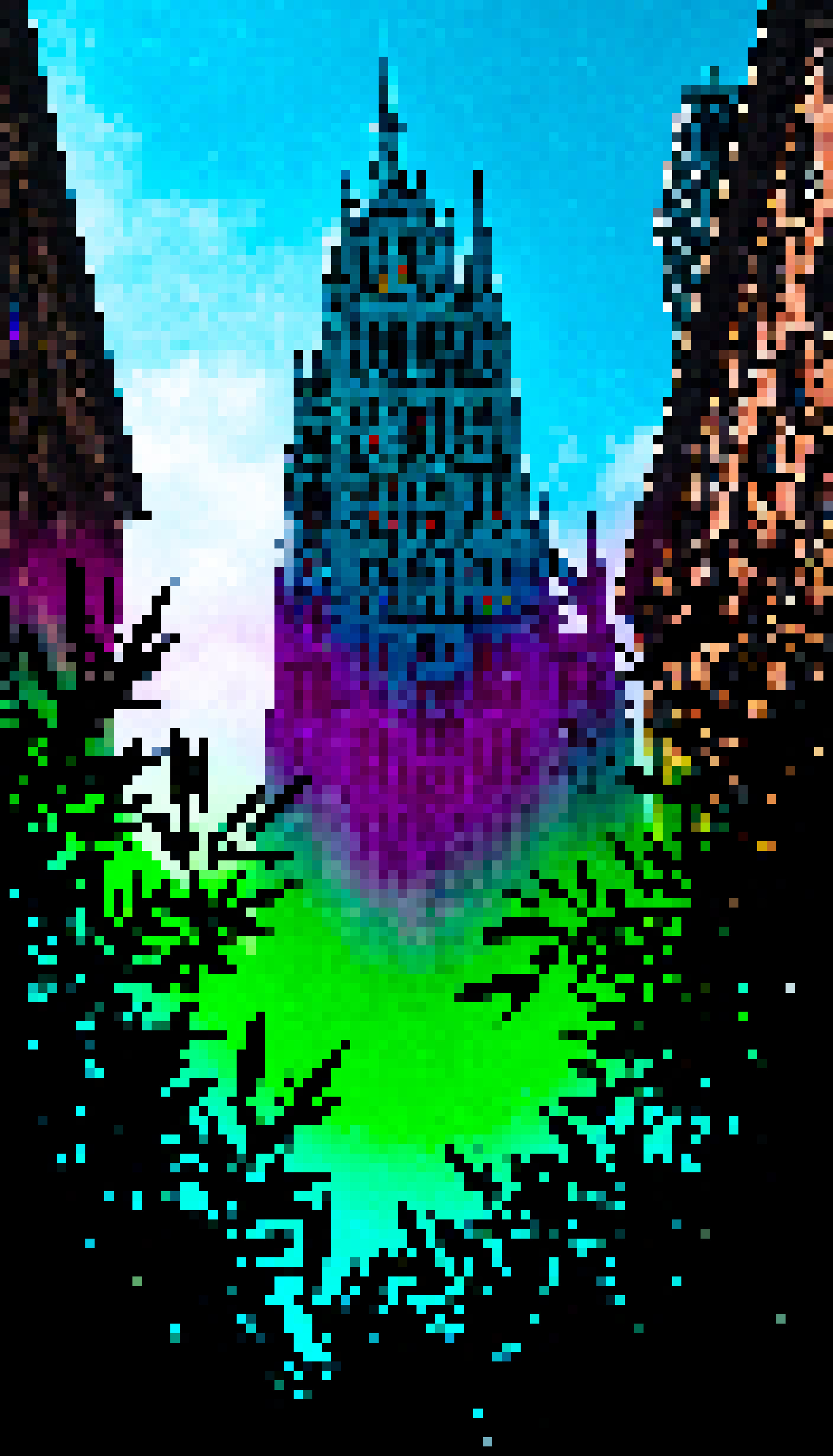 The perspective of the image is particularly striking taken from an elevated viewpoint. This perspective allows for a comprehensive view of the Chrysler Building and its surroundings providing a comprehensive overview of this iconic landmark in New York City. The image with its unique composition and colorful elements offers a captivating glimpse into the heart of this bustling city.
