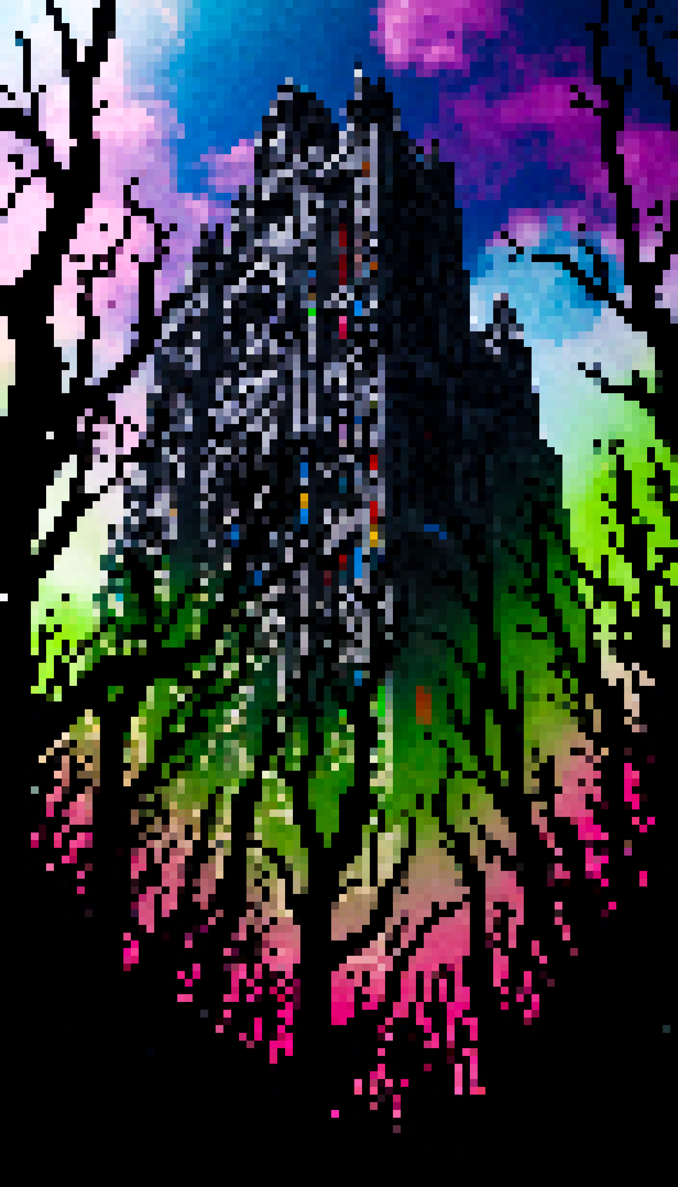 The image captures a scene of an old Gothic-style castle nestled amidst a forest. The castle is characterized by its multiple spires and windows. It's painted in shades of purple red and green lending it a mystical and eerie appearance.