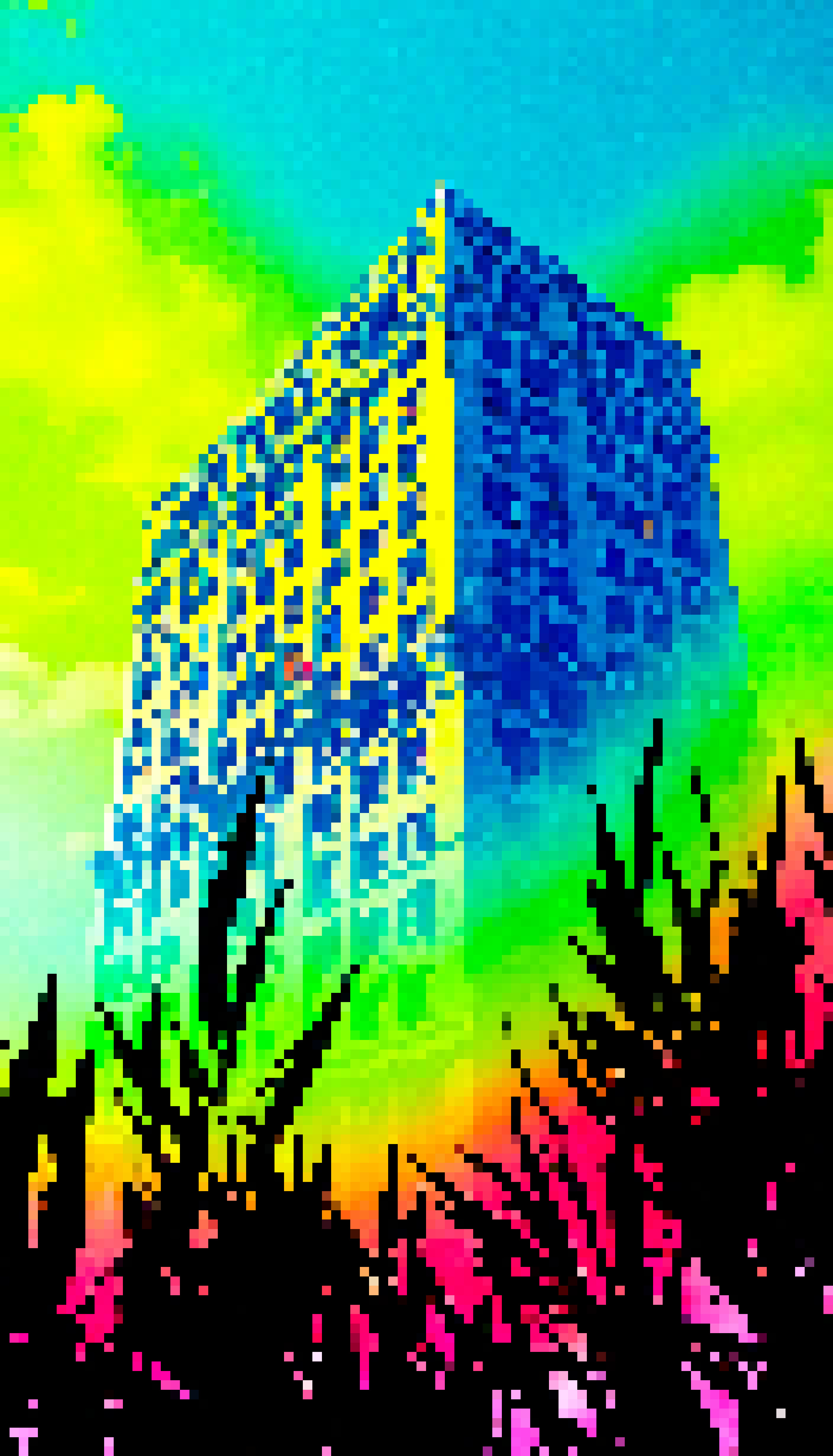 The image is a vibrant digital art composition that features an urban landscape with a colorful building and a clear blue sky background. In the foreground there are brightly colored plants on the left side of the image. A prominent element in the center of the image is a tall building with a facade covered in vertical stripes of light blue green yellow and pink colors which gives it an abstract rainbow-like appearance. The building has a large glass window at its base through which the interior can be partially seen. The window frames reveal that there are lights on inside creating a contrast between the illuminated interior and the vibrant exterior of the building.