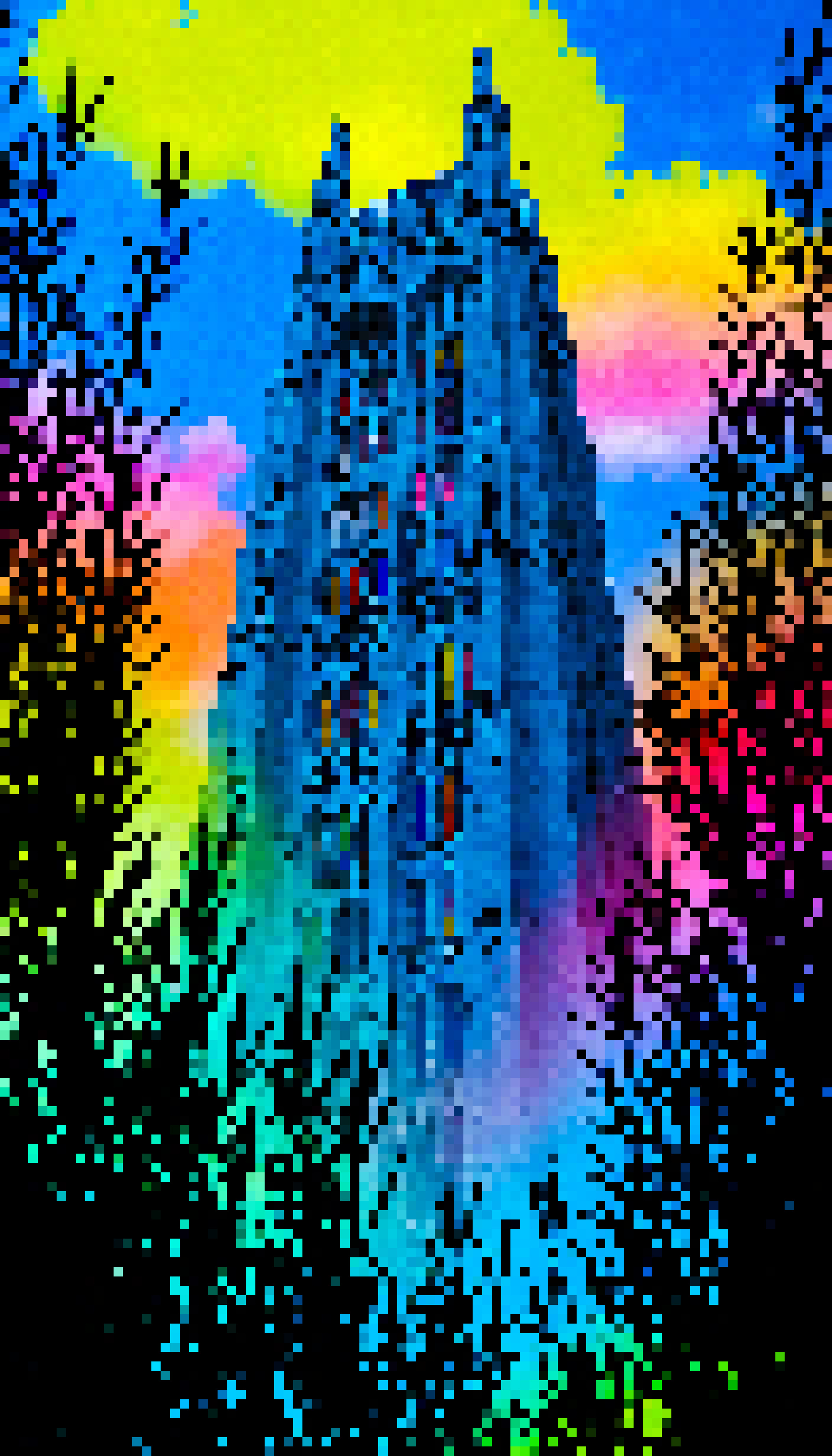 The image is a vibrant and colorful digital art piece that depicts an urban landscape with a church tower as the central focus. The church tower which appears to be made of stone or brick stands tall against the backdrop of a clear sky. It has a spire at the top suggesting its religious nature.