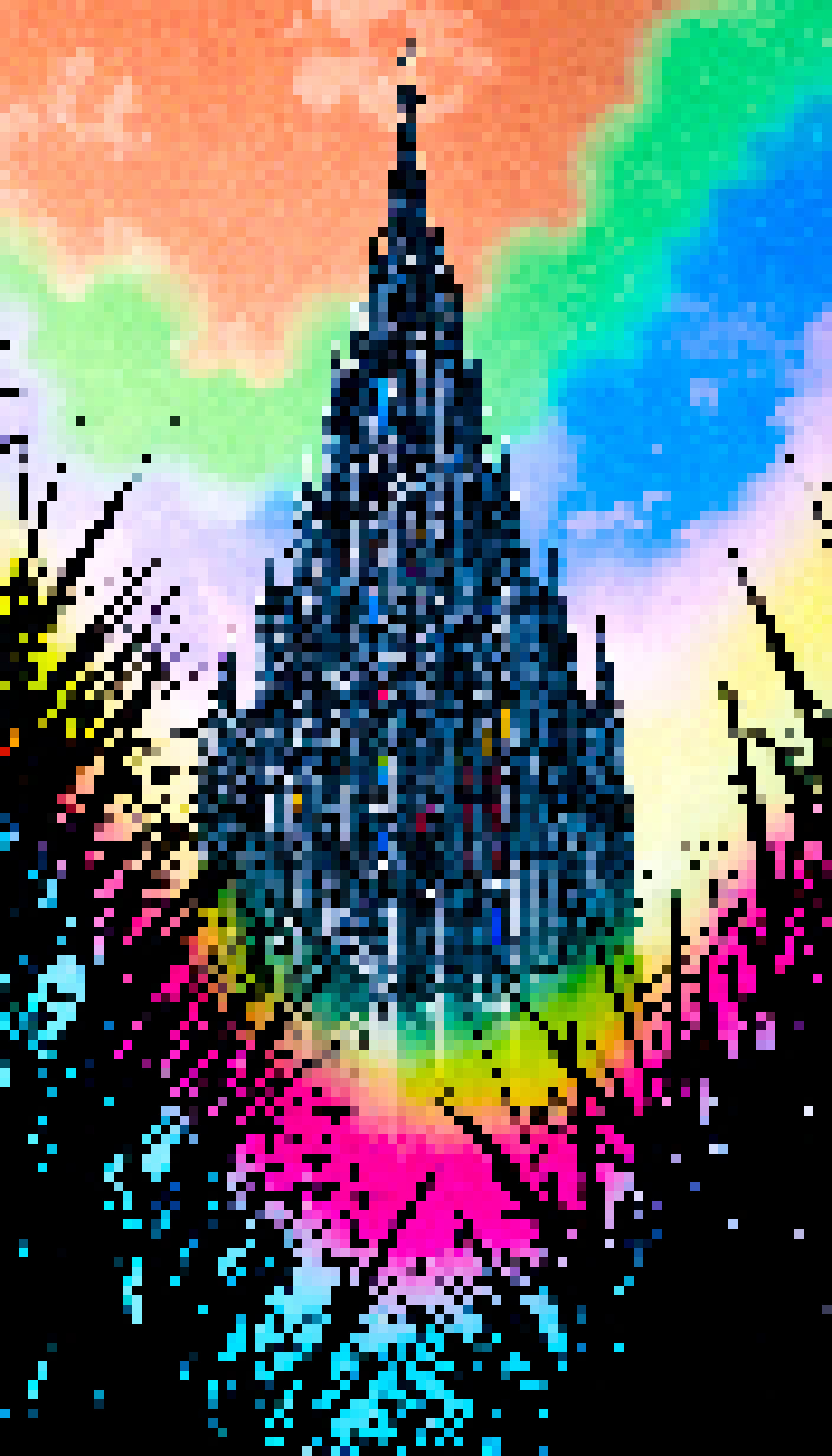 The merging of these two photographs creates an interesting juxtaposition between historical and colorful perspectives. There is no visible text in the image to provide additional context or information. The style of the image is a blend of realism for the historical photo and a more Marisolic possibly digitally altered representation for the rainbow-infused scene.