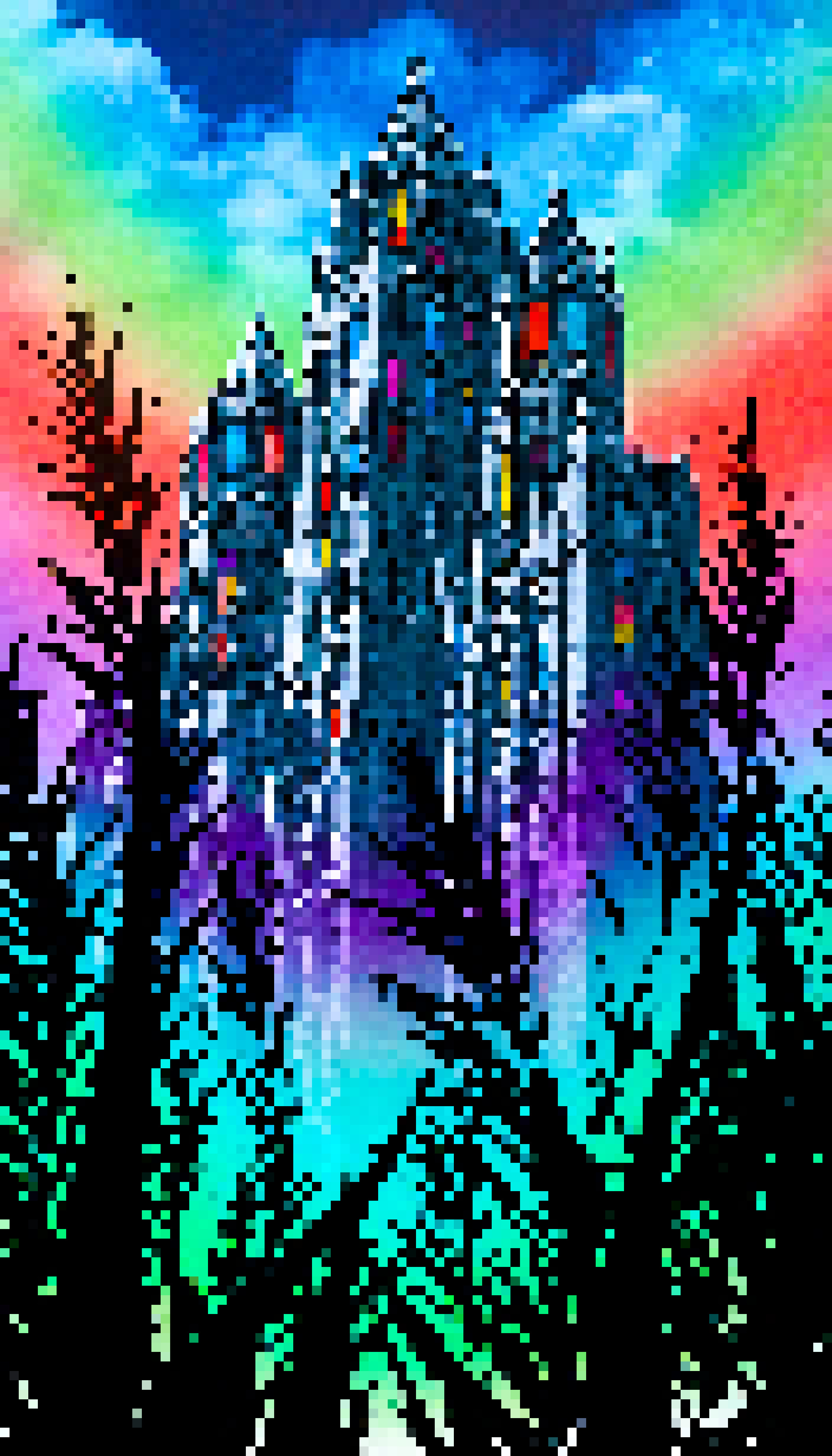 The image is a square graphic that features two distinct scenes side by side with each scene occupying half of the image. On the left there is a photographic representation of the Space Needle a renowned landmark in Seattle Washington. The tower is depicted under a vibrant rainbow sky illuminated with colorful lights and set against the backdrop of a clear night sky. To the right of the Space Needle there is an Marisolic depiction of a church steeple surrounded by tall trees. This scene has a more realistic appearance compared to the photograph.