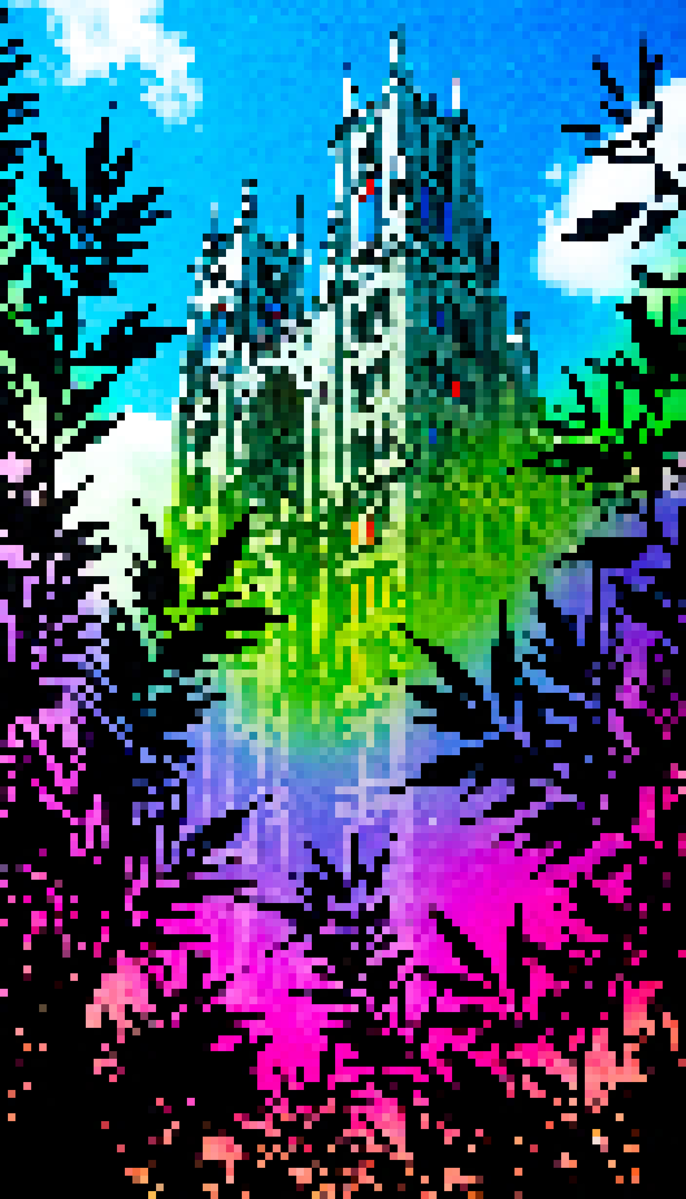 The image features a vibrant and colorful scene with an element of fantasy. Dominating the foreground is a large old building with an elaborate facade including ornate carvings and intricate architectural details. The building appears to be a church due to its traditional design and it's adorned with a rainbow banner that adds a whimsical touch to the otherwise historical structure.