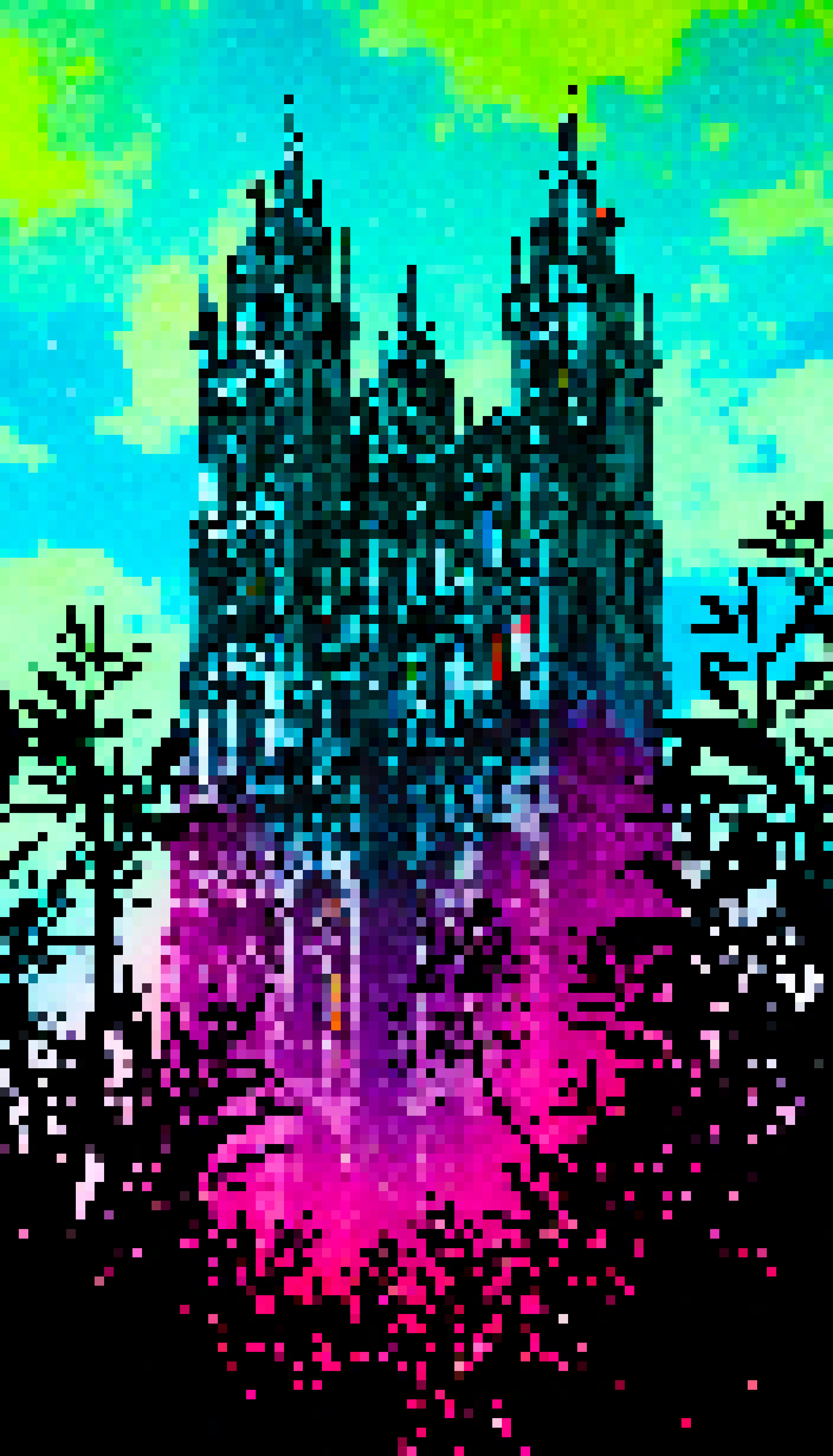 The image is a vibrant and colorful digital artwork of a castle-like structure amidst an overgrown landscape. The central building features ornate architecture with multiple towers stained glass windows and intricate designs all bathed in hues of pink blue and purple. Surrounding the building are verdant plants and trees that seem to have taken over the area. In the background a bright blue sky is visible contrasting with the lush greenery of the foreground. The bottom right corner of the image contains an overlay text "100% WATERMARK FREE" in bold white letters.