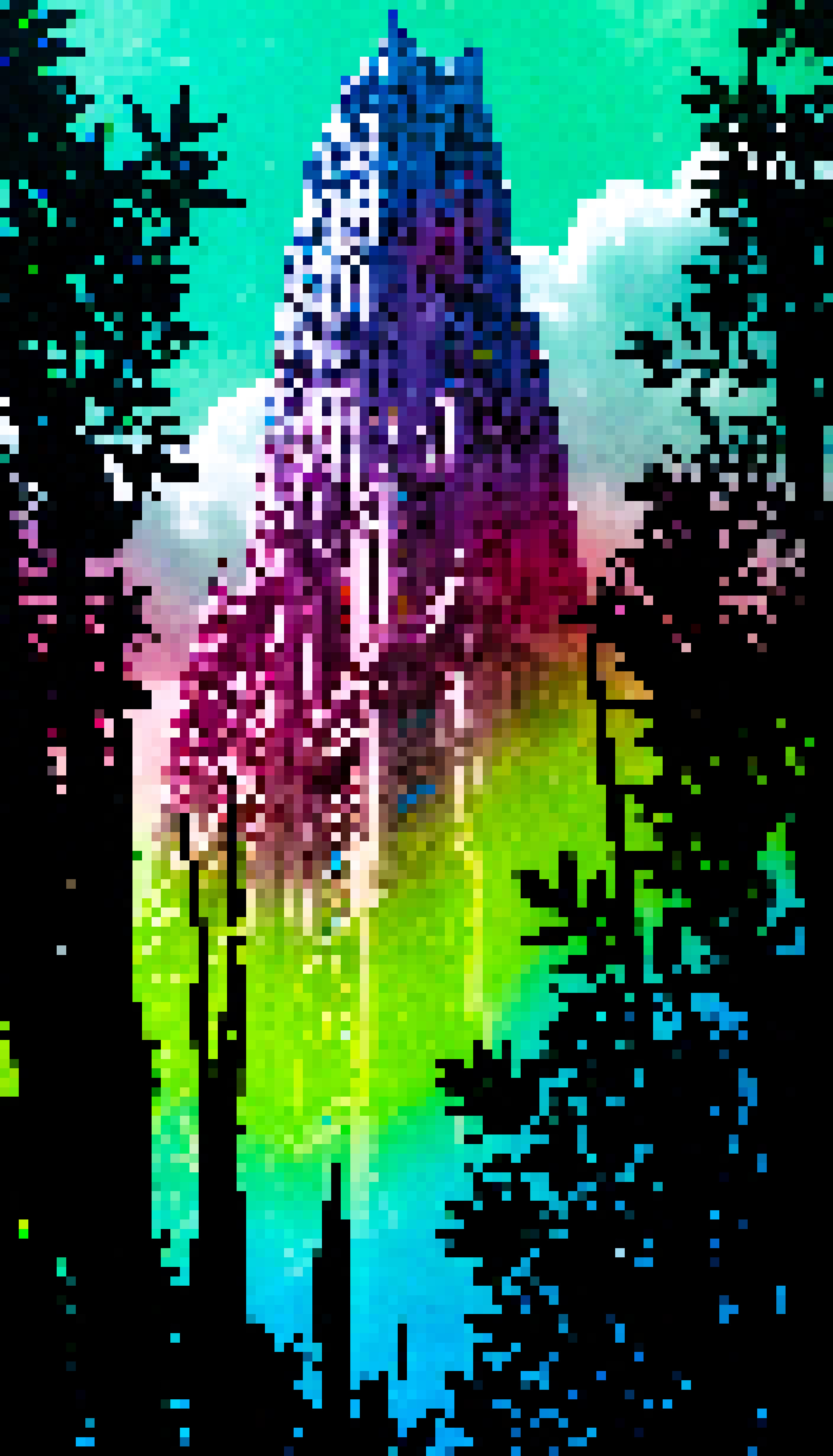 This is a composite image featuring a vibrant psychedelic poster overlaid with several layers. The poster prominently displays an image of the Space Needle skyscraper towering above a cityscape with the sky as a backdrop. The top layer of the image shows a close-up view of tree leaves and branches which are in focus and appear to be set against a colorful background. This layer is semi-transparent and allows a partial view of the skyscraper underneath. Below this layer the Space Needle poster is visible with its colors appearing more subdued due to the opacity of the tree image above it. The colors on the poster are vivid and include various hues predominantly in shades of green blue and pink. There are no texts or additional graphics present in this image.