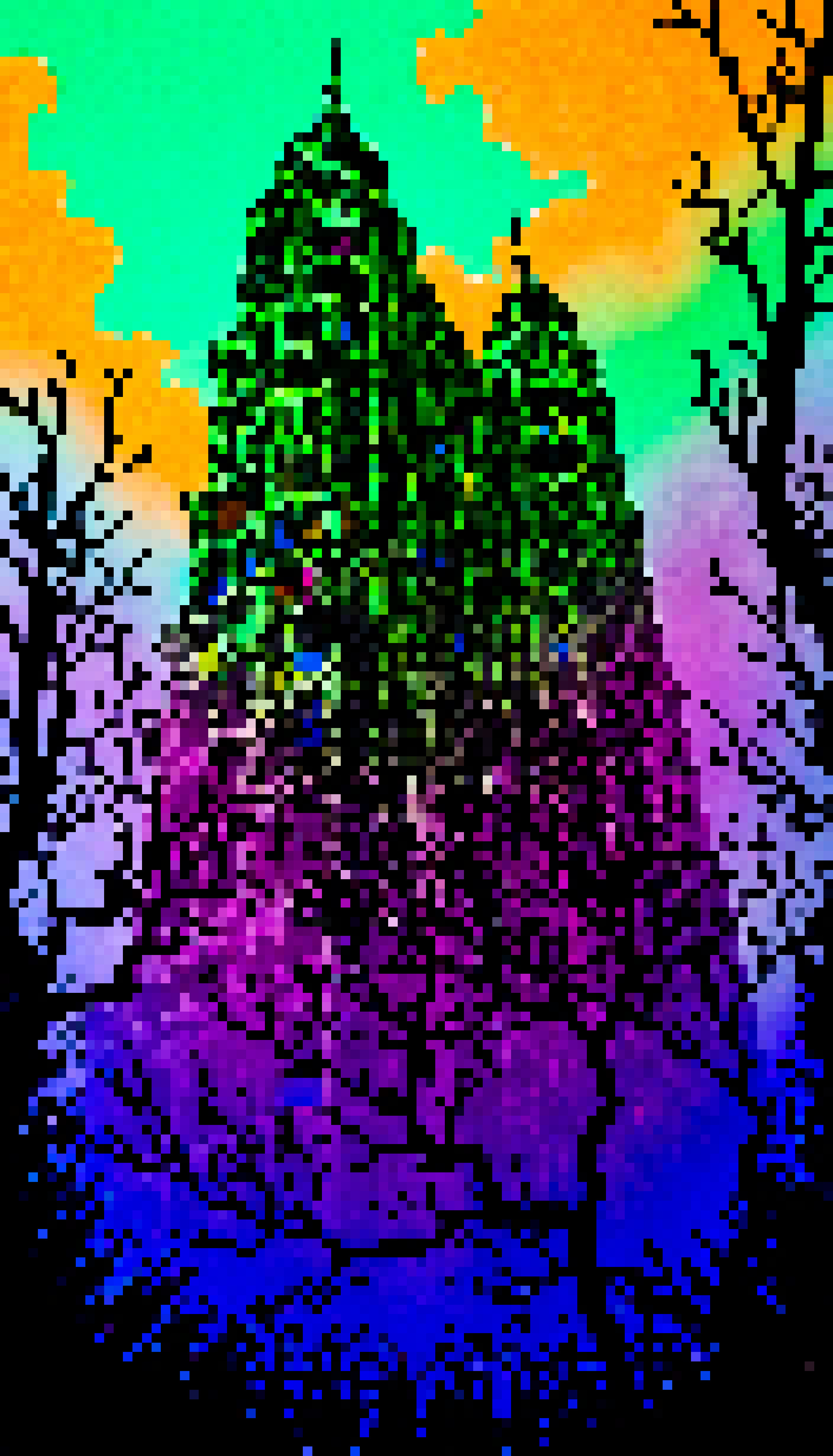 The image portrays a vibrant scene set against the backdrop of a night sky. Dominating the center is a tall castle-like structure painted in shades of purple and blue. It stands as a stark contrast to the surrounding area which is predominantly dark.