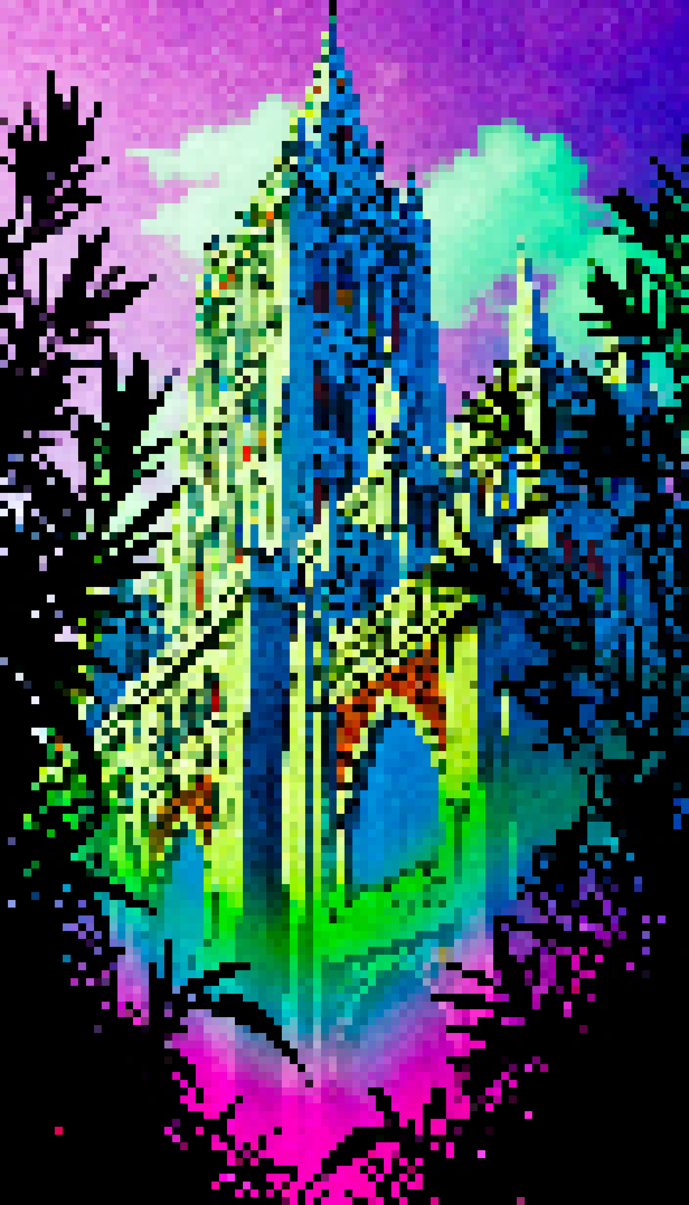 The image is a vibrant and colorful collage predominantly featuring a castle-like structure with a high tower and multiple windows that are lit up giving off an otherworldly glow. In the foreground there's an overlay of what appears to be a photo of a lush green plant possibly a tree or bush covering much of the image. The colors within the image are highly saturated with the castle structure exhibiting bright hues and the plant cover providing a natural contrast.