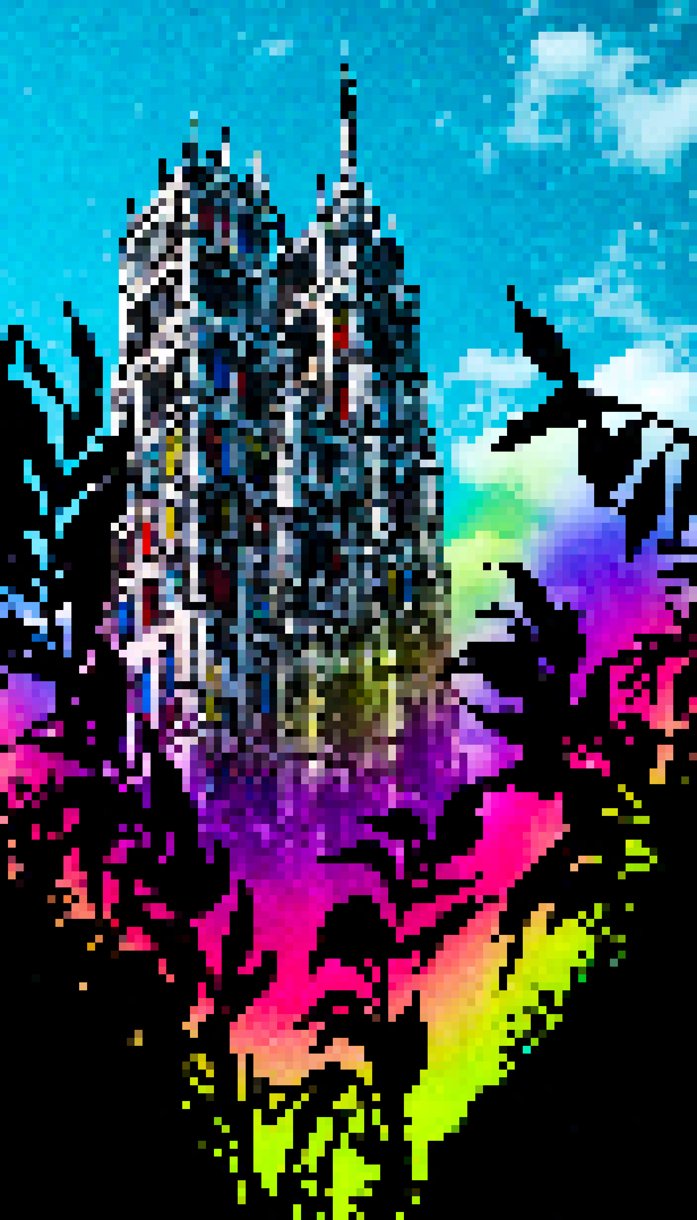 The image is a composite that shows two different scenes blended together resulting in an unusual and surreal scene. In the foreground there is a detailed illustration of a tall multi-colored building with a gothic architectural style featuring numerous spires and ornate details. The building is set against a backdrop of a vibrant rainbow that extends into a clear blue sky.