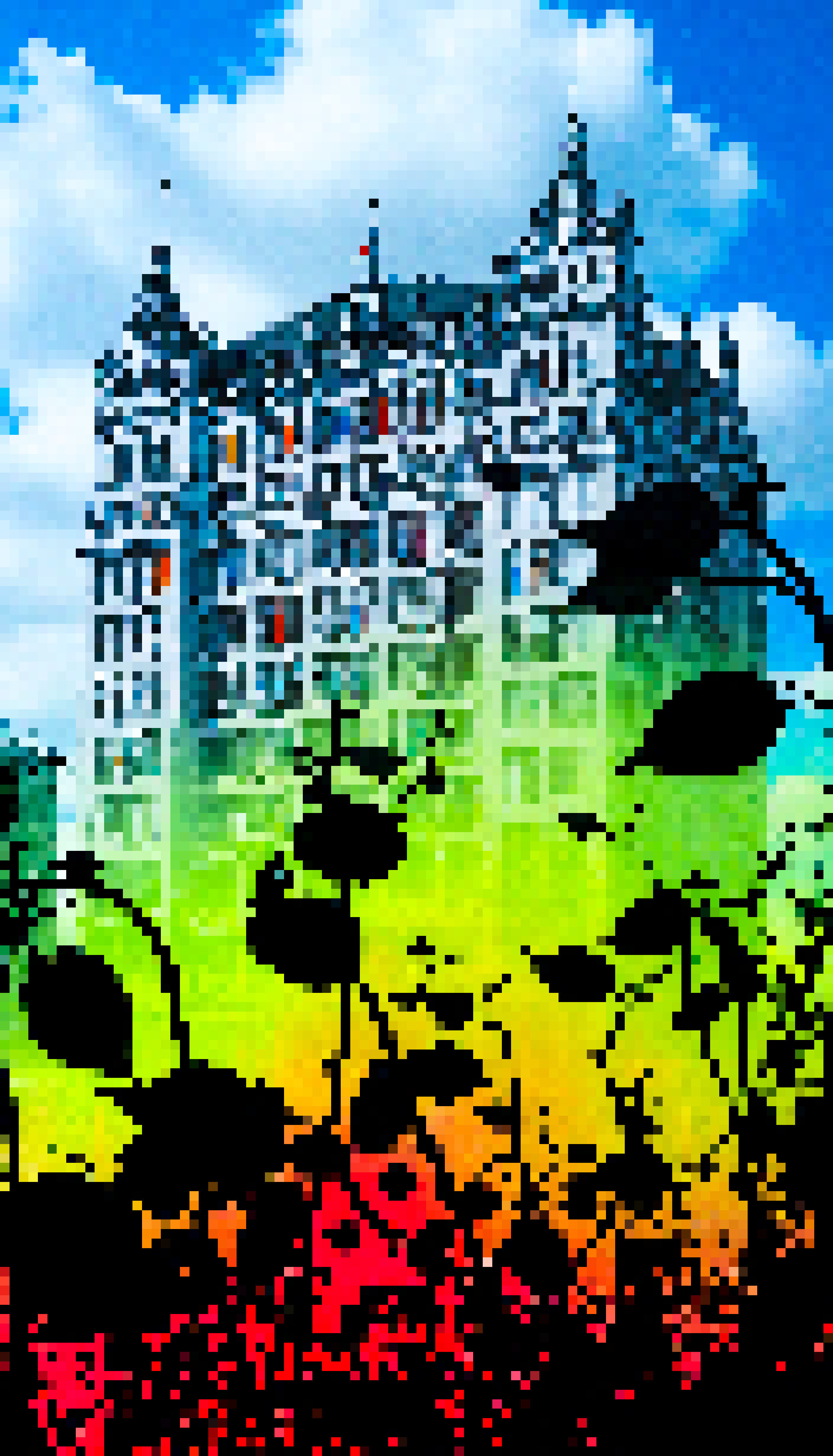 The image is a collage of two separate photographs arranged side by side against a grey backdrop. On the left side of the collage there is a photograph featuring an urban landscape with a prominent building which resembles a castle-like structure adorned with red curtains on each window. Above this building the sky is visible and appears to be blue with wispy clouds. In the foreground there are green plants and tall weeds suggesting a garden or park setting. On the right side of the collage another photograph showcases a scene with vibrant colors: a rainbow-colored sky fading into a blue hue and below it a landscape of greenery with patches of red and yellow vegetation. A large red brick building is partially obscured by green foliage in this image as well.