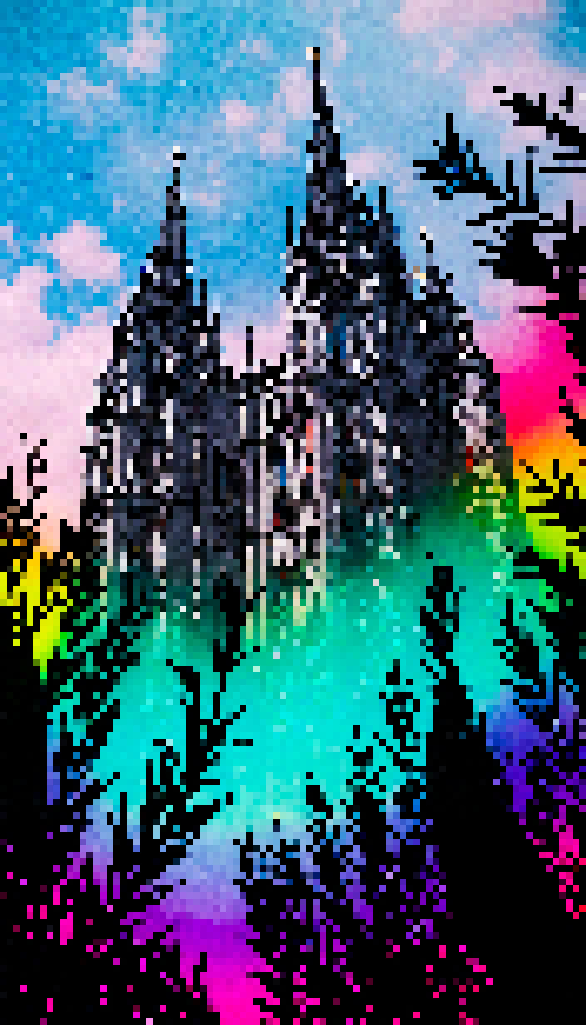On the right side there is an overlaid graphic element with a rainbow of colors creating a vibrant psychedelic effect that partially obscures the cathedral image. The rainbow has a gradient from green at the bottom to purple red and orange towards the top. The overlapping colors create a dynamic visual contrast between the historical building in the background and the colorful graphic in the foreground.