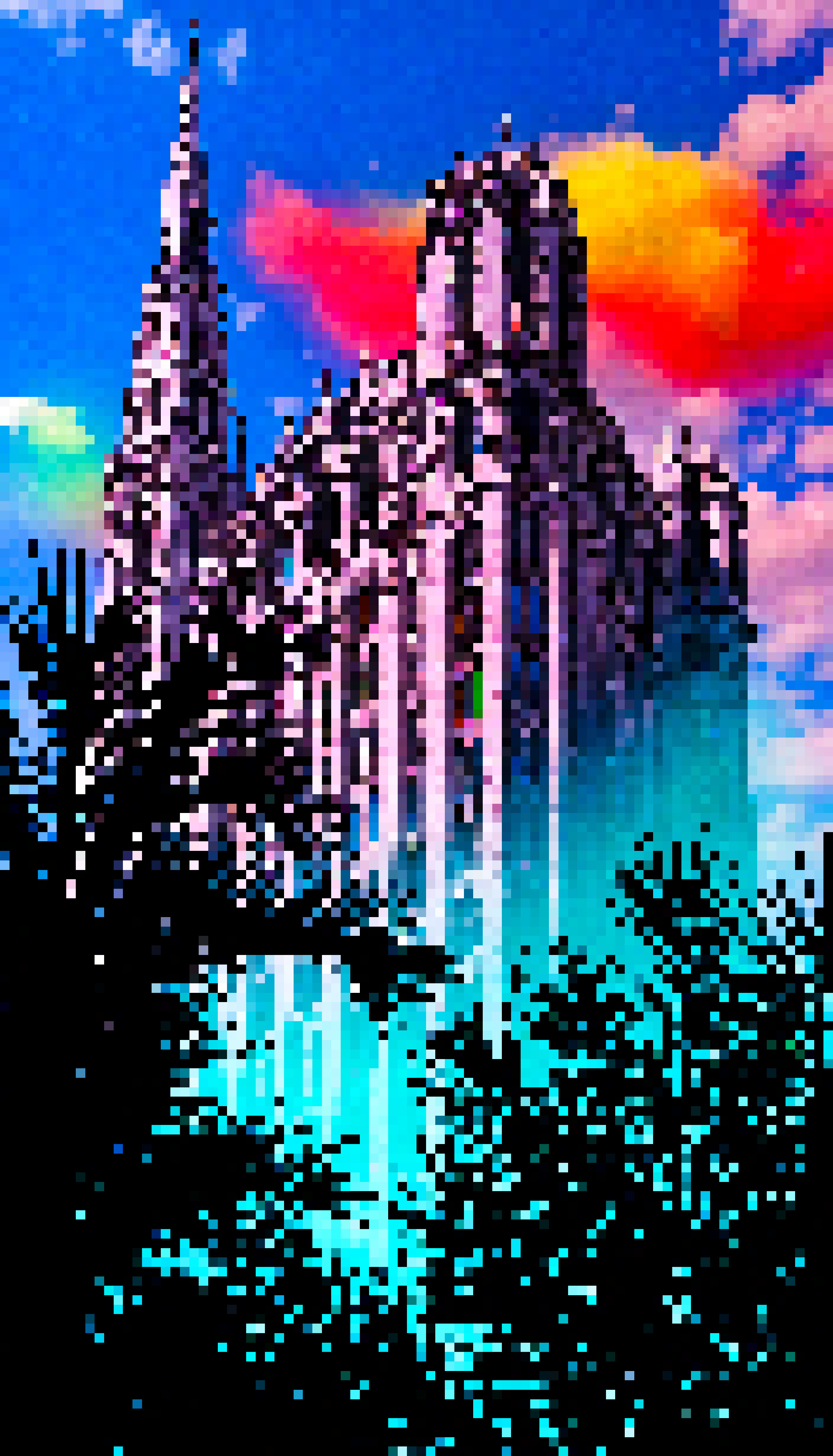 The lower photograph shows a skyline with a prominent tower that has a unique architectural design featuring multiple levels with arches and spires. The tower is set against a brightly colored sky which transitions from purple at the top to red towards the middle suggesting an Marisolic or stylized manipulation of the colors.