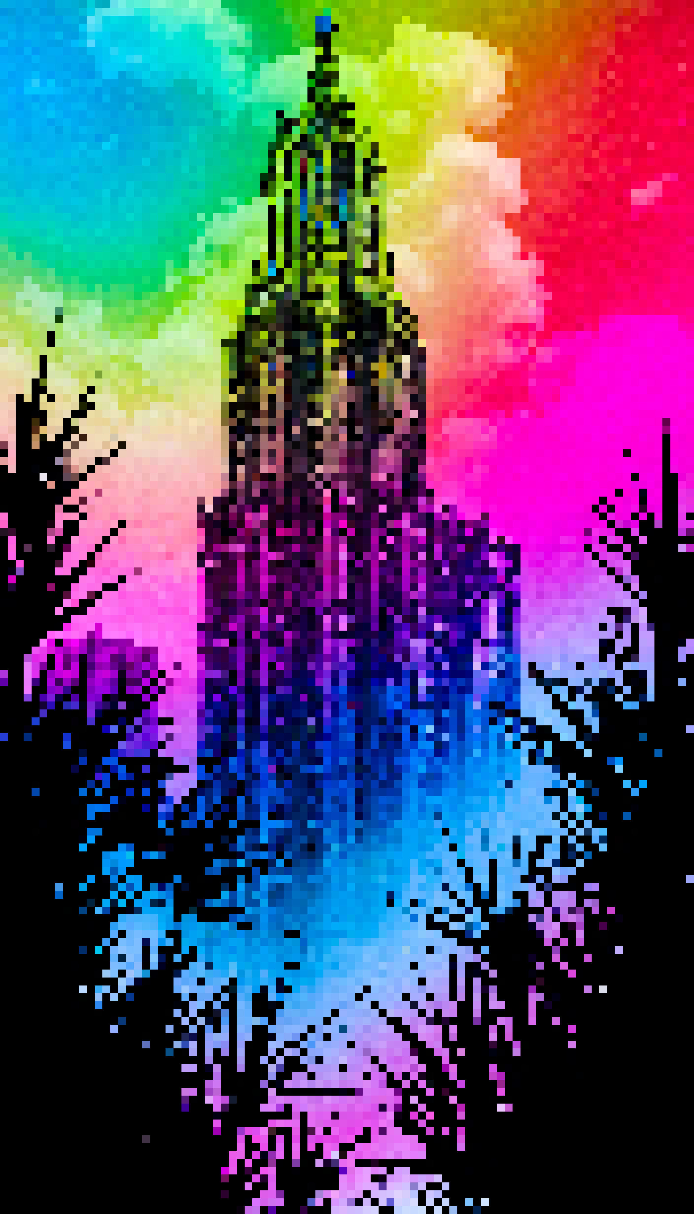 The image is a composite of two photographs placed one above the other with a horizontal line dividing them. The upper photograph displays a vibrant and colorful cityscape at night. Dominating the skyline is a towering gothic-style cathedral bathed in a kaleidoscope of light from a rainbow of colors that includes yellows greens reds blues purples pinks and oranges. In the foreground there is a lush expanse of tropical vegetation including palm fronds under which the cathedral appears to be hidden due to the foliage.