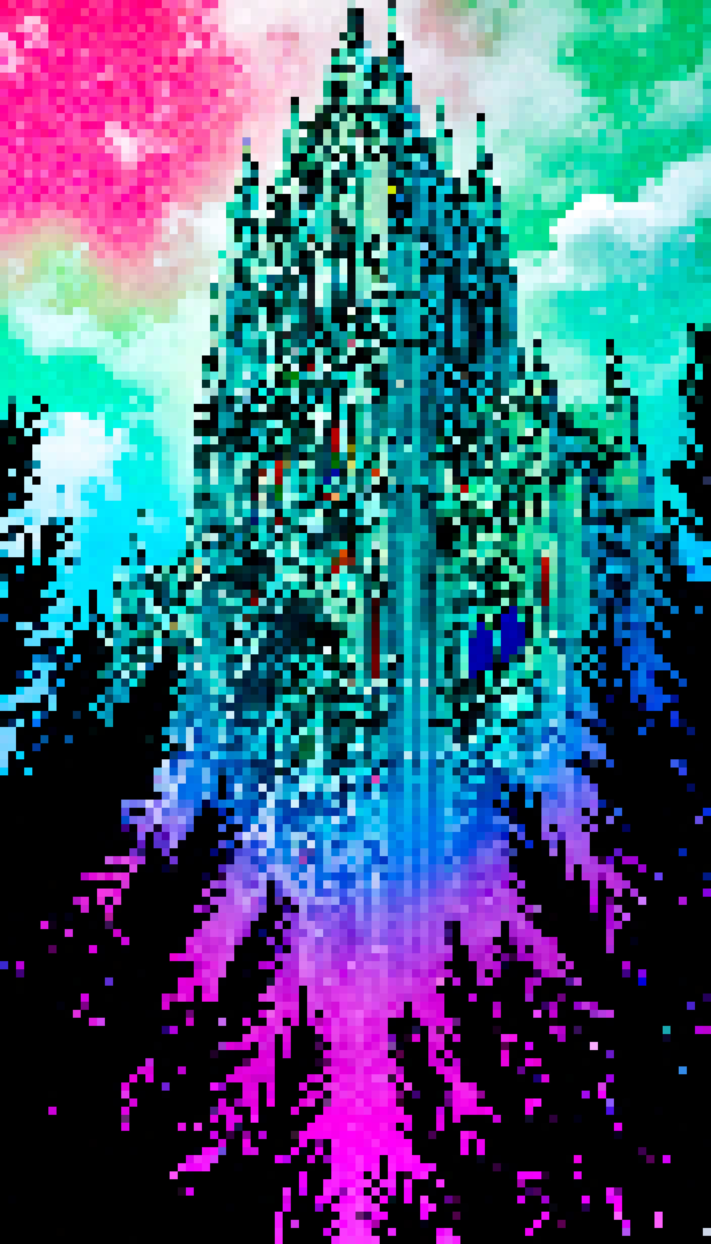The image displays a digital artwork that superimposes two distinct scenes. In the foreground there is a vibrant psychedelic illustration of a cathedral with tall towers and intricate details. The architecture features pointed arches flying buttresses and a facade that suggests Gothic style.