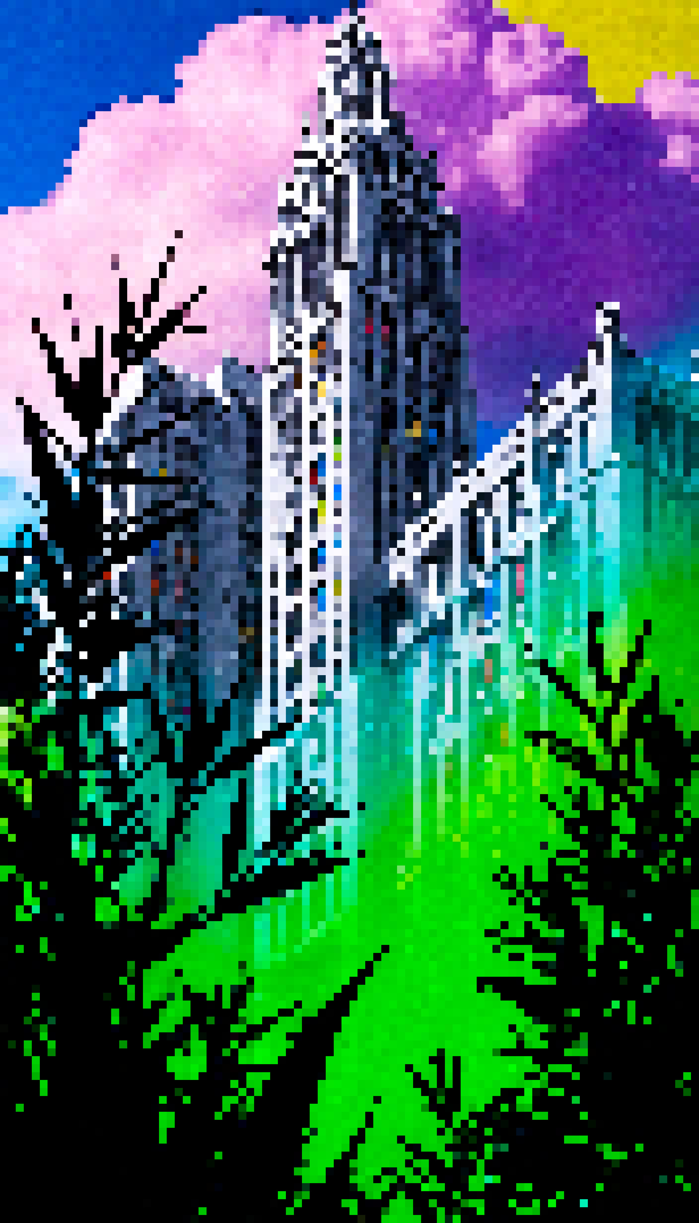 A prominent layer features tall thin plants or trees their green leaves stretching across the image and casting a shadow over the building. These plant elements create an illusion of growth as if the cityscape is being overgrown by nature.