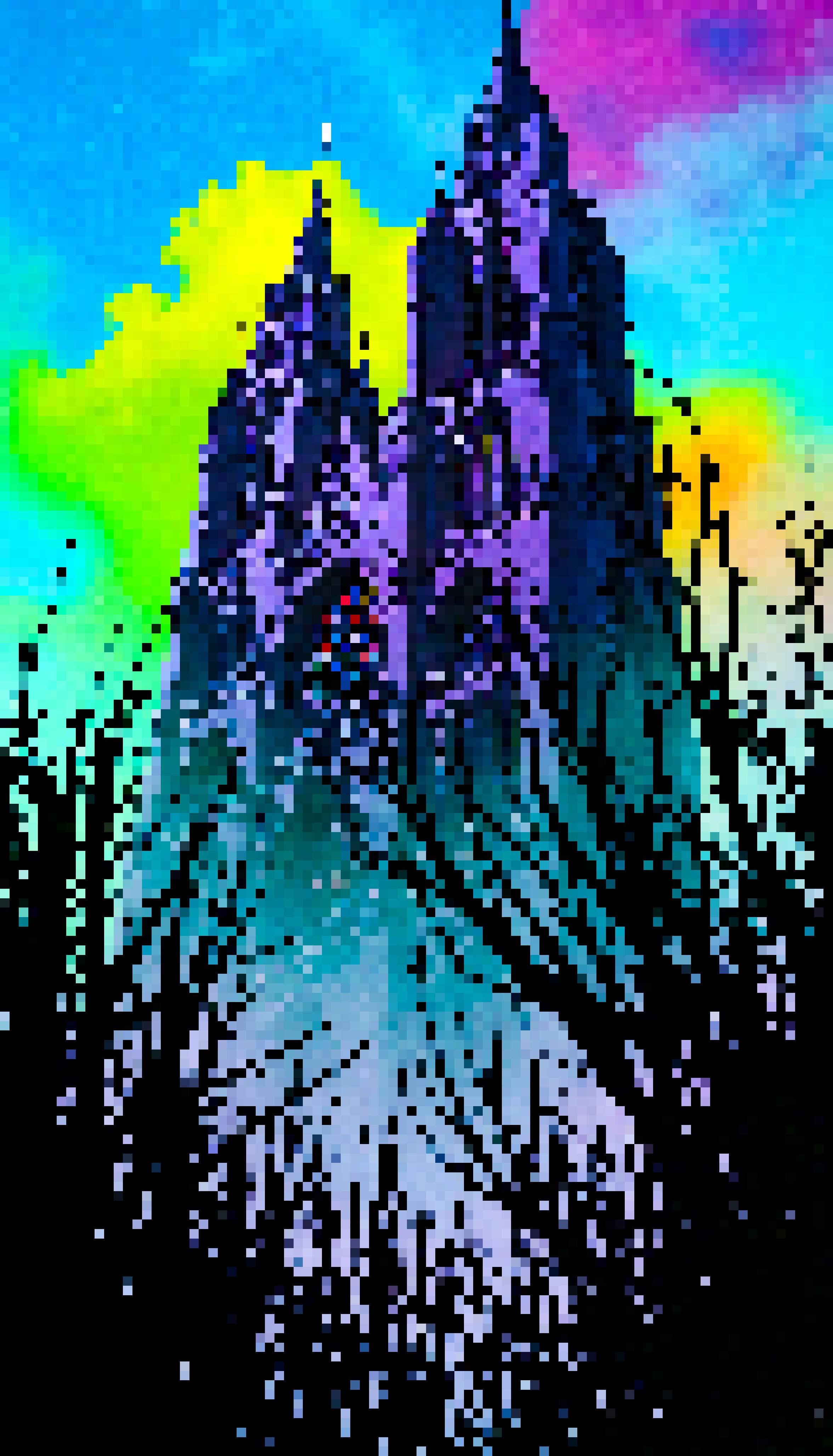 This is a digital artwork featuring an illustration of a large gothic cathedral with multiple spires and flying buttresses. The cathedral's exterior has intricate stonework patterns with pointed arches and the central part appears to have a rose window. Surrounding the base of the cathedral are dead leafless trees and bushes suggesting an autumn or winter season. A vibrant green sky serves as a backdrop with a small portion of a purple rainbow just above the horizon adding a whimsical touch to the scene. The artwork has a rich vivid color palette emphasizing the contrast between the dark gothic architecture and the lively fantastical elements in the sky. There is no visible text within the image.
