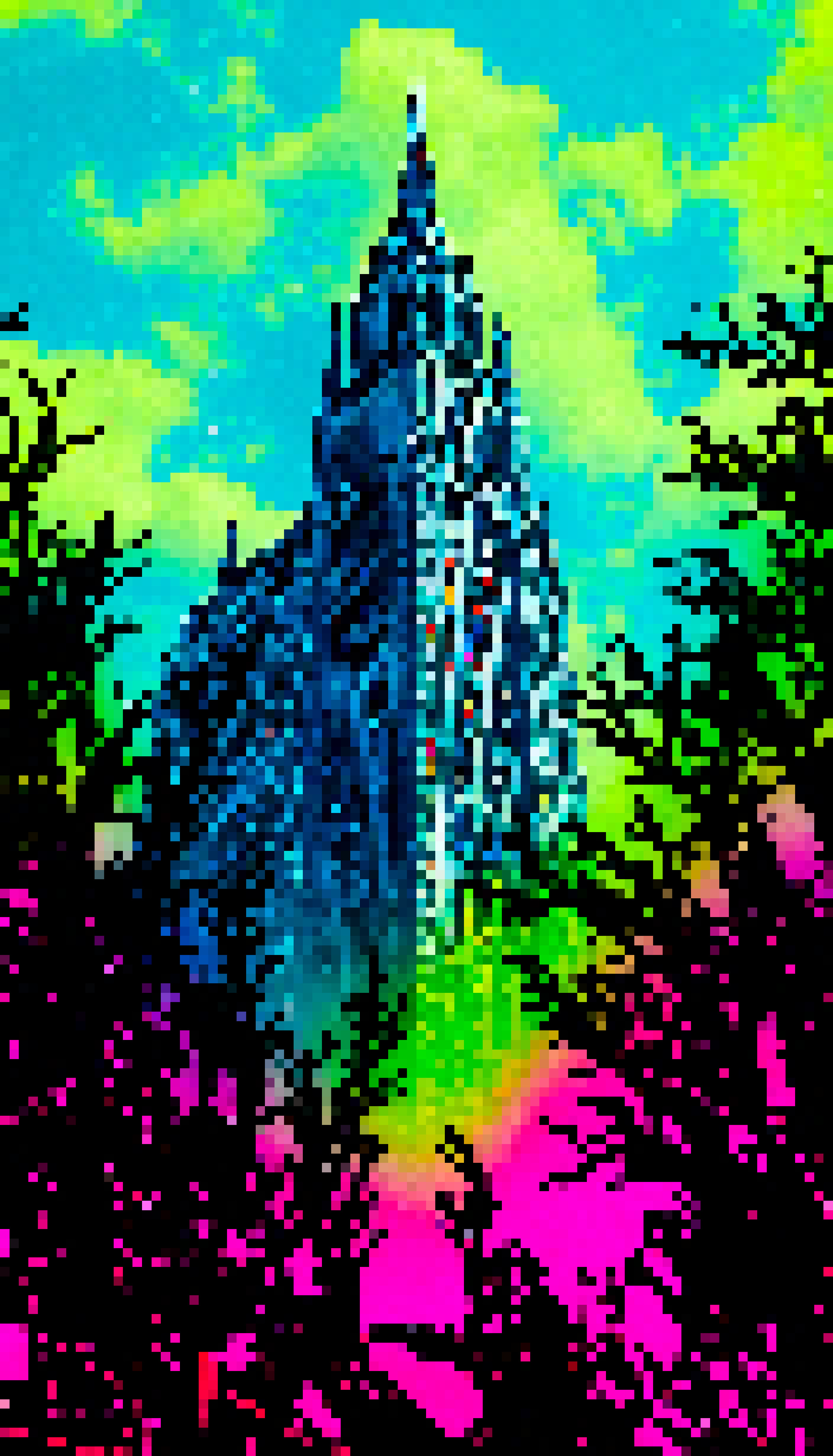 The image presents a vibrant and colorful view of the Space Needle a landmark skyscraper located in Seattle Washington. The photograph is taken from a low angle looking up at the building which stands tall against the backdrop of a clear blue sky dotted with fluffy white clouds. The Space Needle itself is adorned with green and red foliage adding a touch of nature to the urban structure.