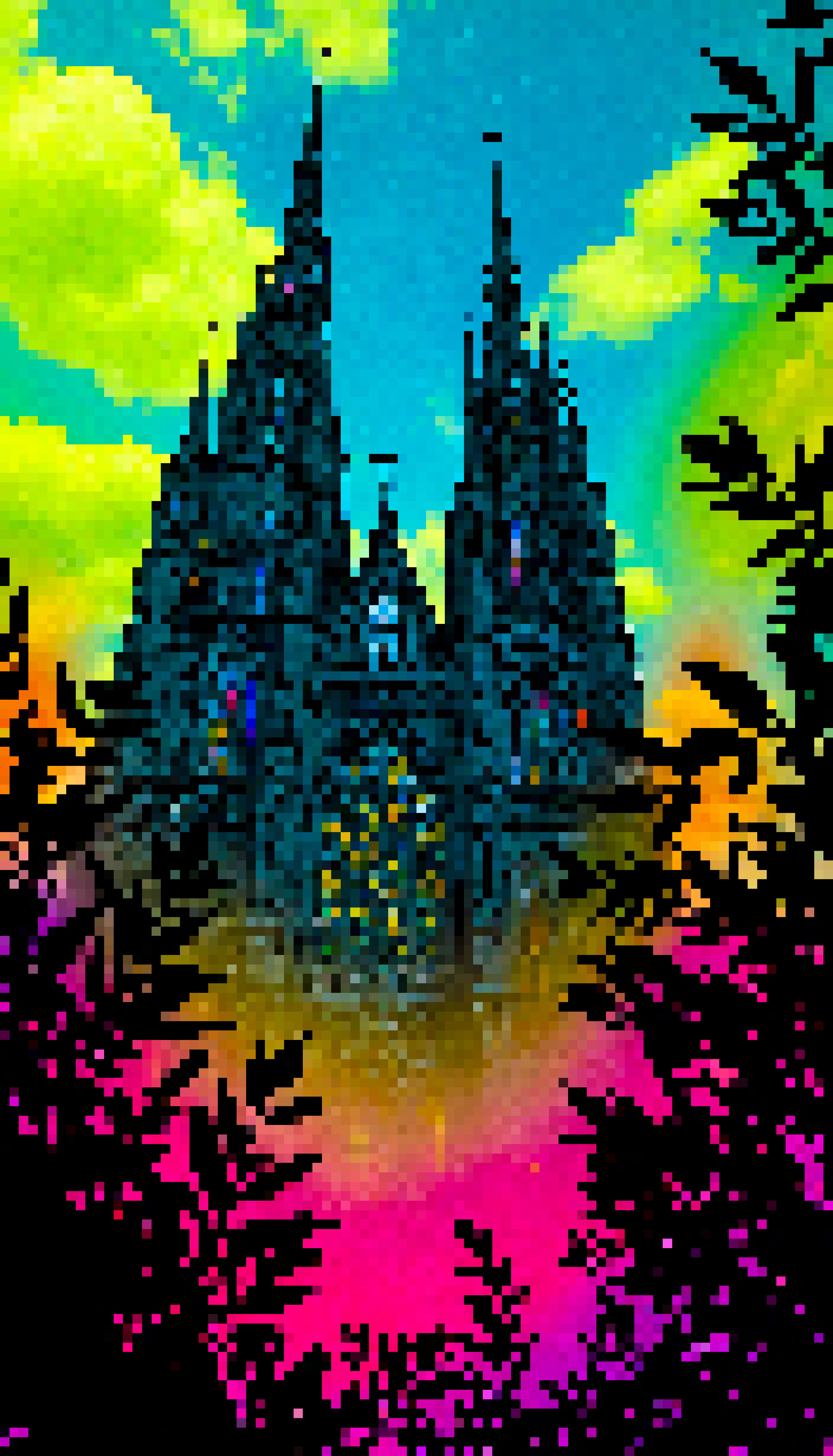 To the right of the image there's a gray wall that serves as a canvas for an intriguing mix of green and blue flowers further enhancing the vibrant feel of the artwork. The cathedral with its detailed architecture and towering presence is clearly the focal point of this image.