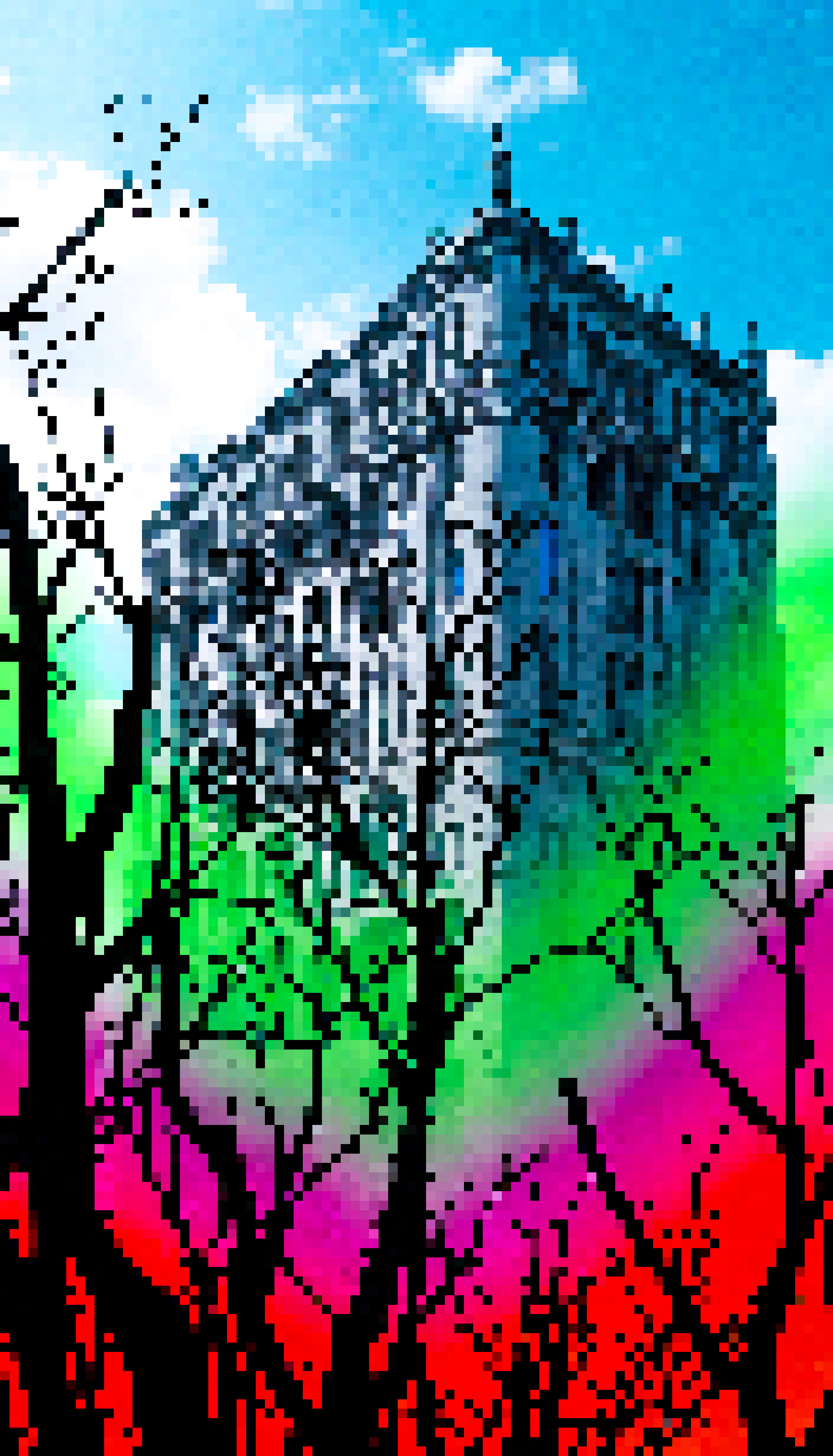 The image is a composite of multiple photographs arranged vertically and separated by thin horizontal lines. At the top there's a photograph showing a building with a large clock tower. Below it another photo captures the same building under a sky with some clouds but with the trees in front obscuring part of the view. The middle section features a colorful abstract pattern that resembles a digital glitch or a pixelated effect. This part is predominantly in shades of purple red and green. At the bottom there's another photograph showing a leafless tree with bare branches extending outwards from the trunk. The tree is set against a background of a building similar to the one shown in the top two images. The overall style of the image suggests an Marisolic or digital manipulation rather than a single unedited photograph.