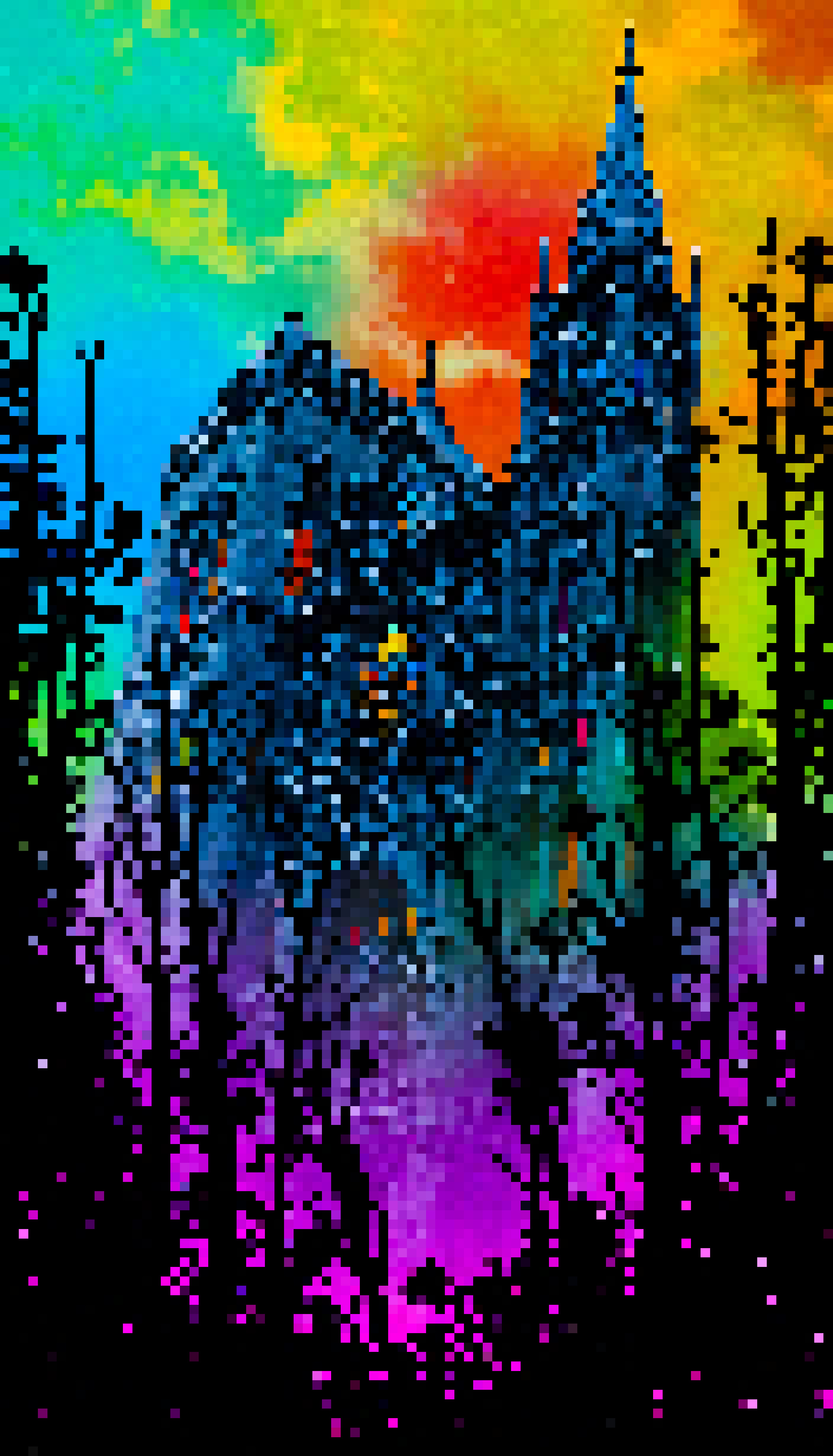 The image presents a captivating view of a cathedral which is the main subject of the artwork. The cathedral painted in hues of blue and purple stands tall against a backdrop that transitions from green to red creating a vibrant contrast with the cool tones of the building.