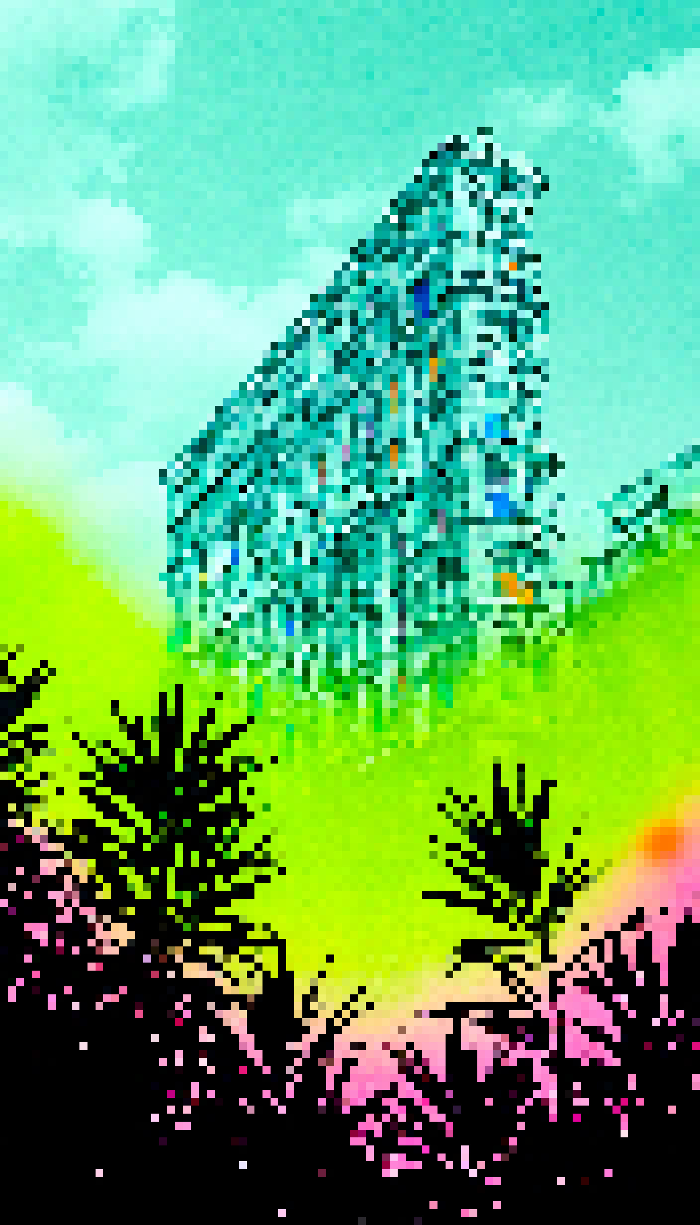 On the right side there is an illustration set against a background that resembles a tropical landscape with palm trees and lush greenery. This section has a vibrant almost psychedelic color palette predominantly using shades of green pink blue and yellow. The buildings depicted in the right side are not detailed or realistic but rather seem to be stylized or abstract representations with a prominent structure that might be inspired by Art Deco architectural styles.