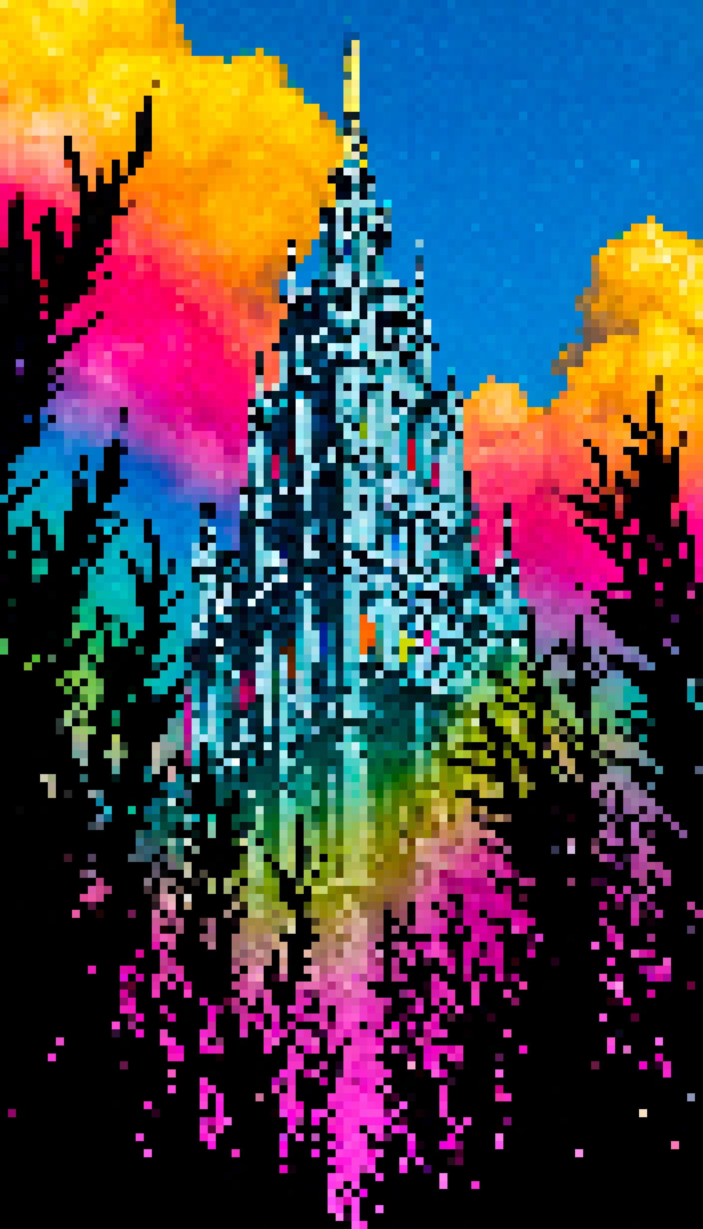 The image is a composite of two photographs creating a layered effect. In the background there's a vibrant cityscape dominated by a large rainbow-colored tower that stands out against a blue sky. Adjacent to the tower is a tall white building with gold accents possibly another significant structure in this urban setting. The foreground of the image features a lush green forest with a variety of trees and foliage in shades of green.