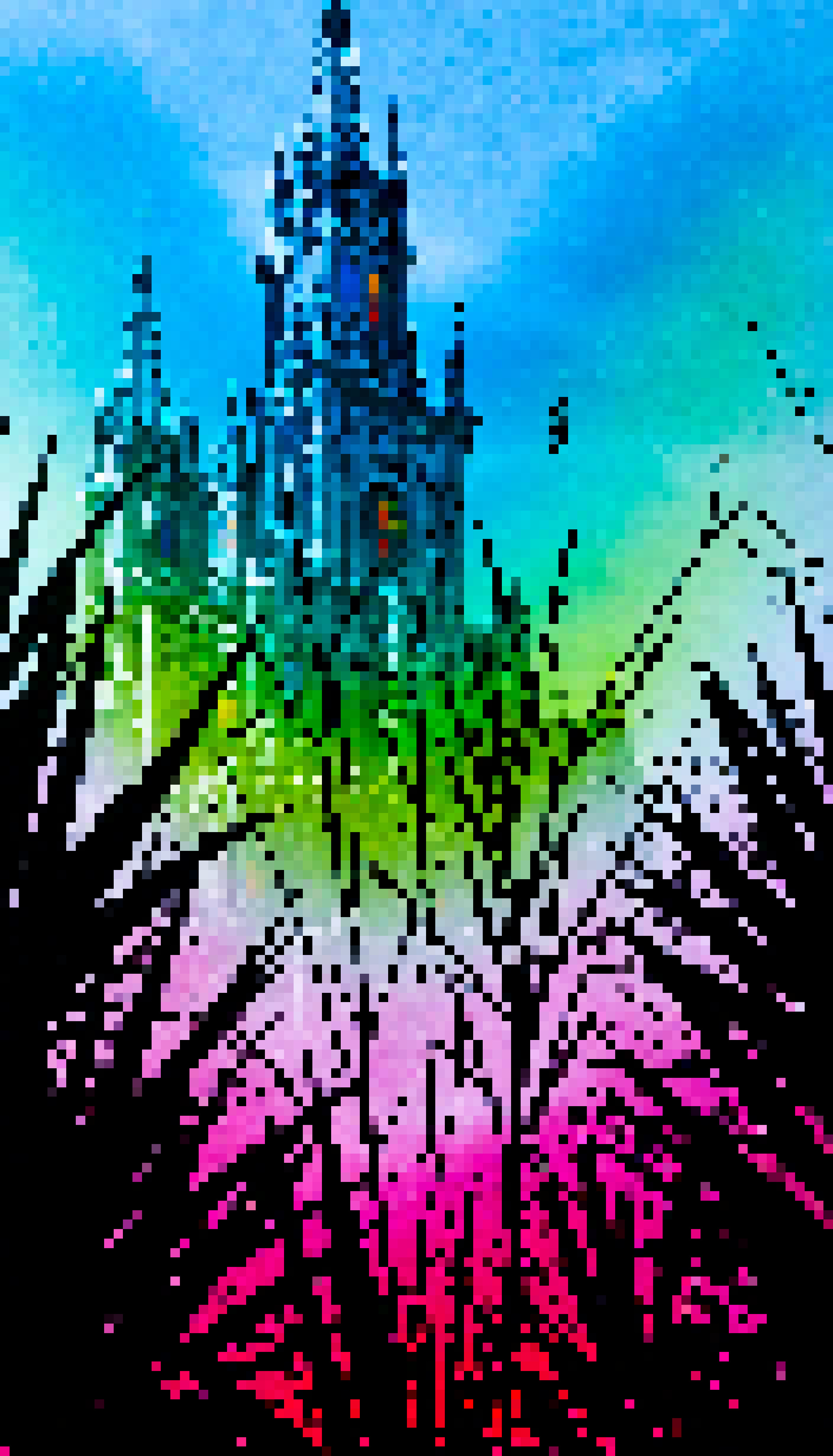 The image presents a vivid and vibrant scene dominated by two main elements: a castle and a jungle. The castle with its multiple spires stands tall in the background bathed in a gradient of colors from yellow to pink. It is adorned with rainbow hues adding a whimsical touch to the otherwise majestic structure.