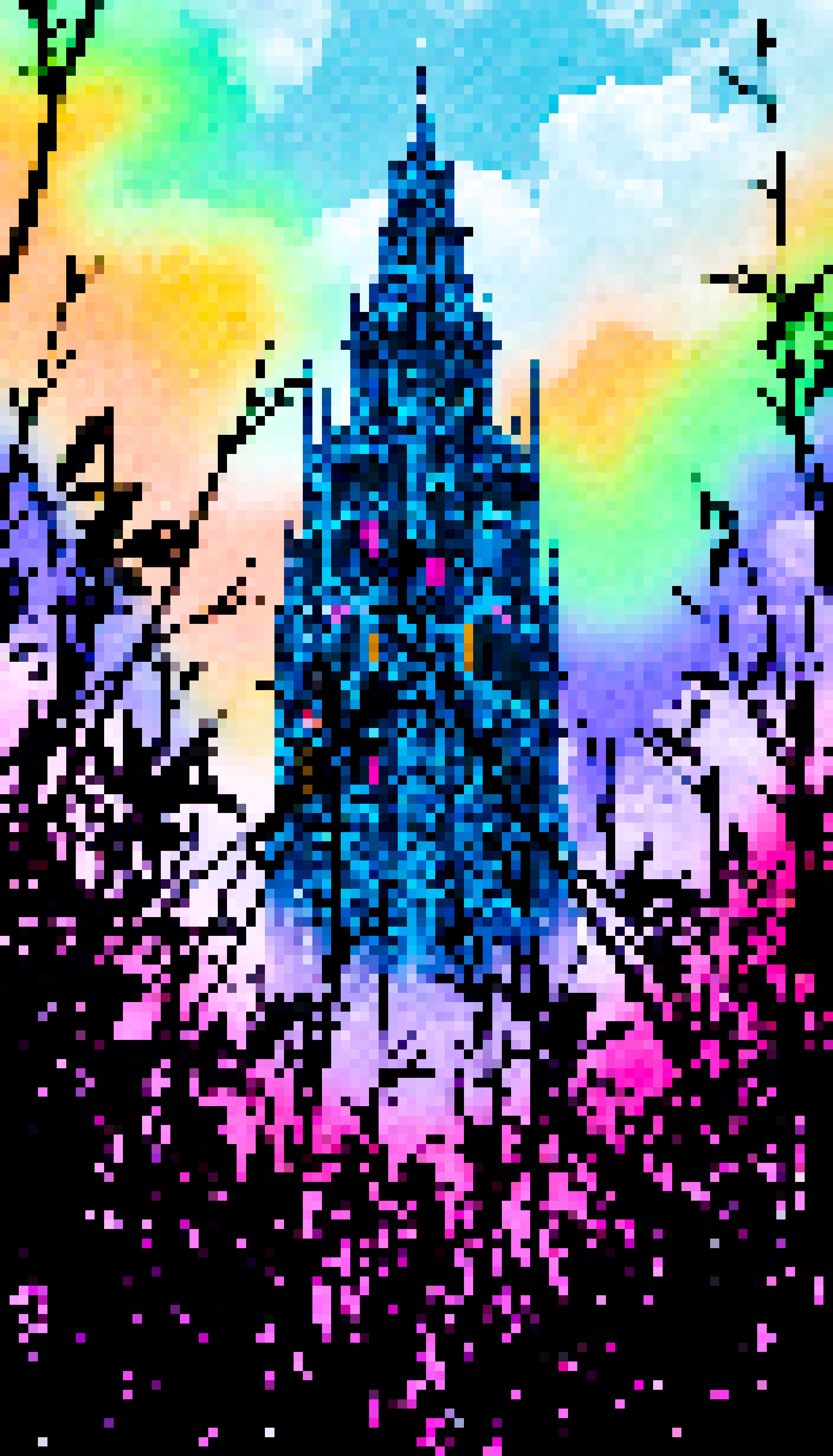 The style of the image suggests it could be an edited or digitally blended composition intended to evoke a sense of fantasy or surrealism by combining elements from different settings – one realistic (the castle) and one fantastical (the rainbow-lit cathedral).