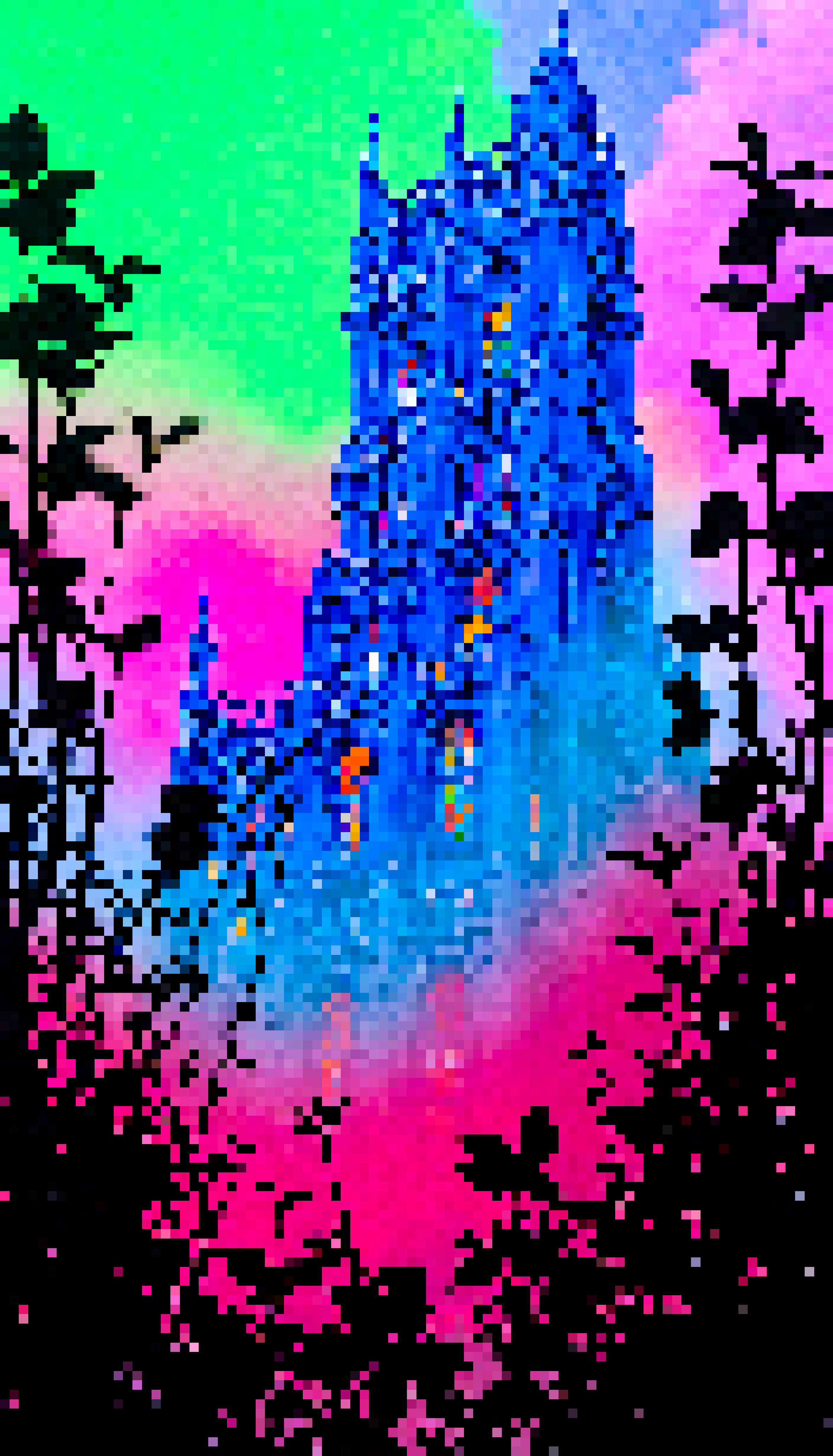 No text is present in the image and the focus is solely on the cathedral and its vivid colorful surroundings. The medium appears to be a digital artwork given the vibrant colors and Marisolic manipulation evident throughout the piece.