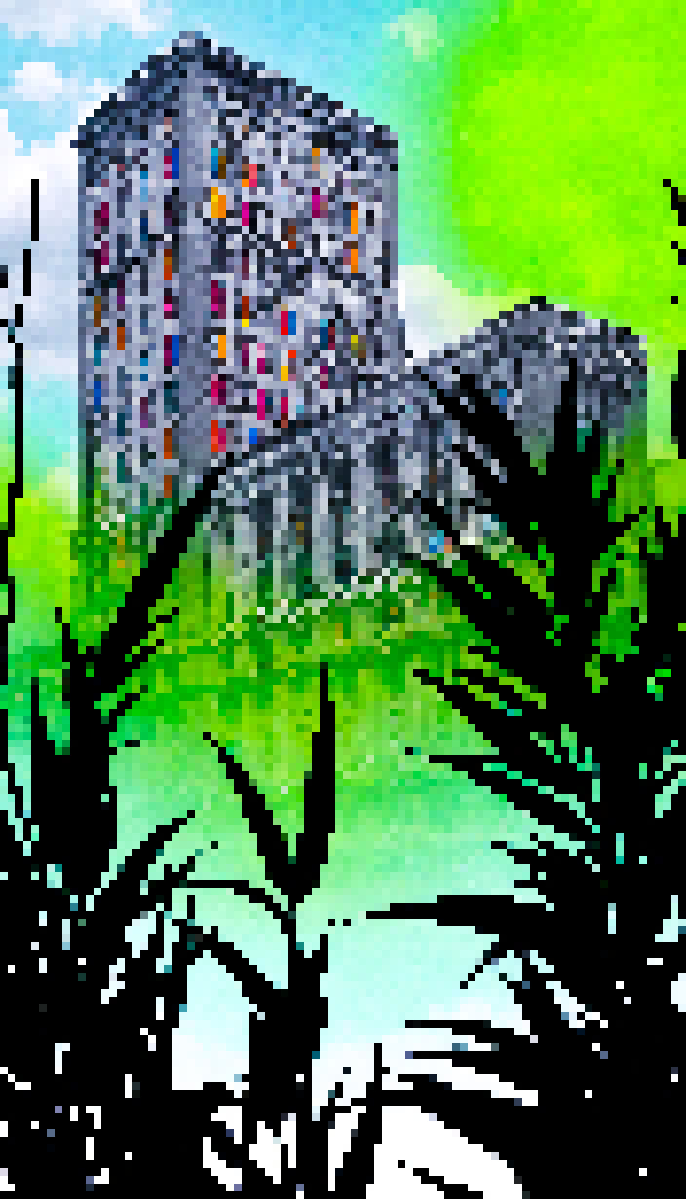 The image portrays a surreal and whimsical scene where reality bends to create an alternate world. Dominating the center of the composition is a tall building its facade adorned with numerous colorful windows. This architectural marvel stands out against a backdrop of lush greenery that spans across the background.